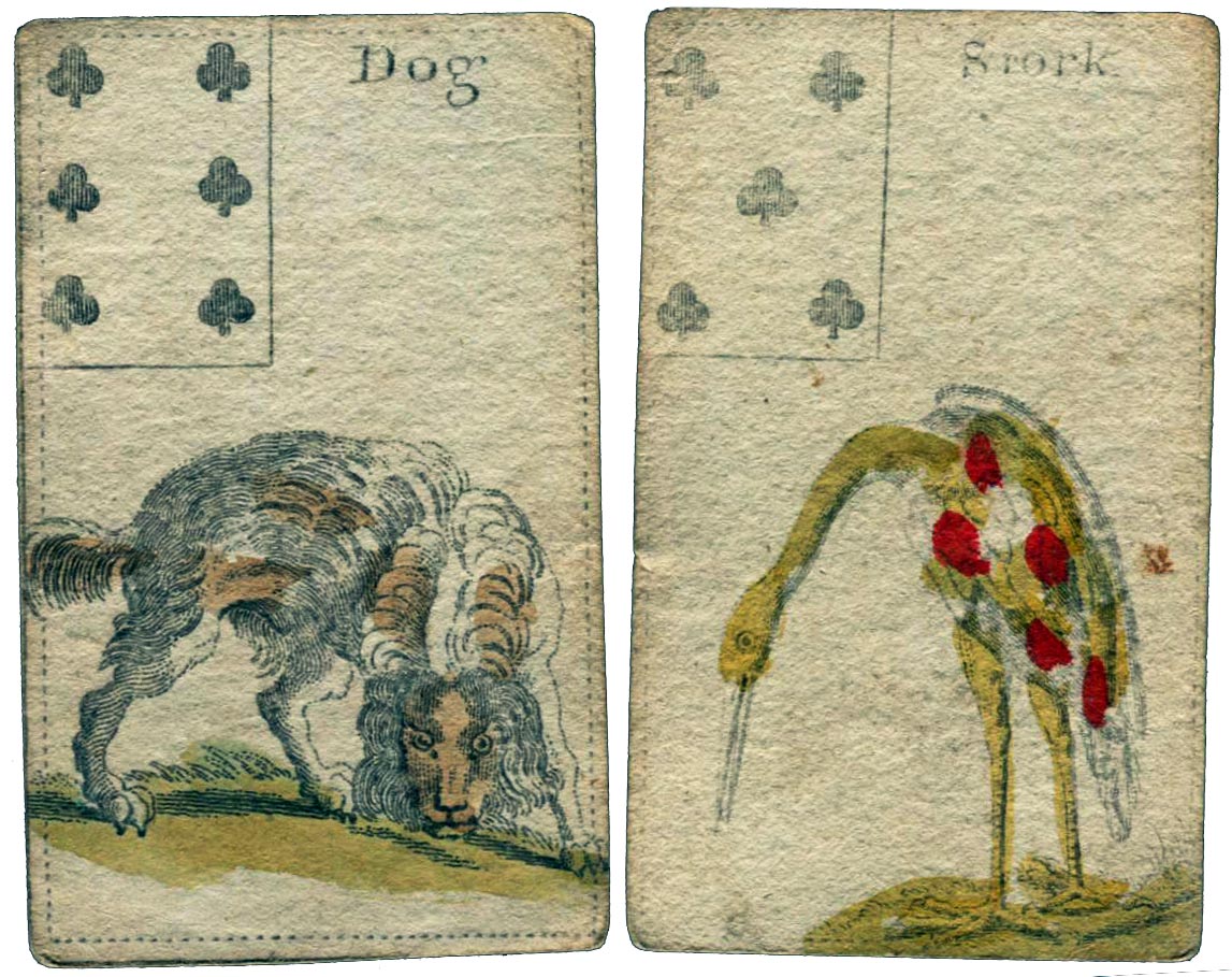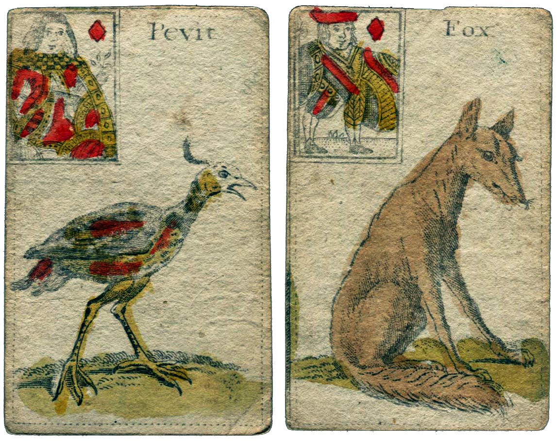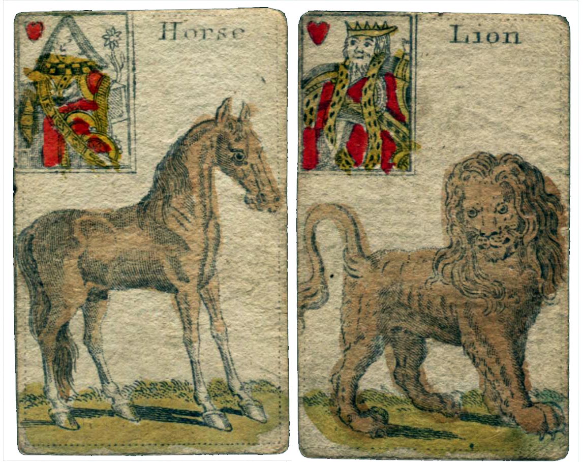 Animals have been a favourite theme on playing cards, from medieval Hunting packs, to Aesop’s Fables, to Animal tarots as well as Edwardian Farmyard Snap games.