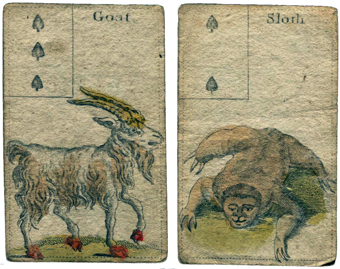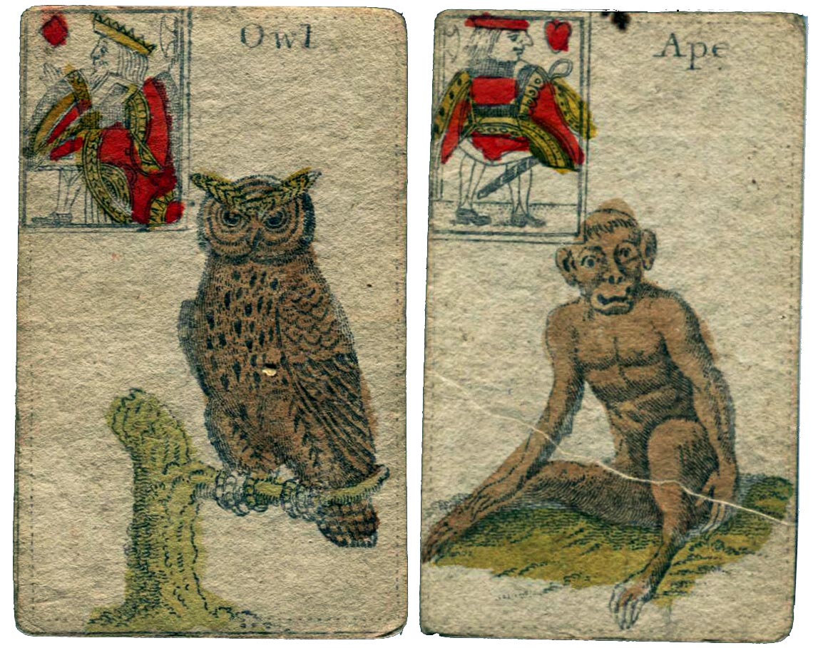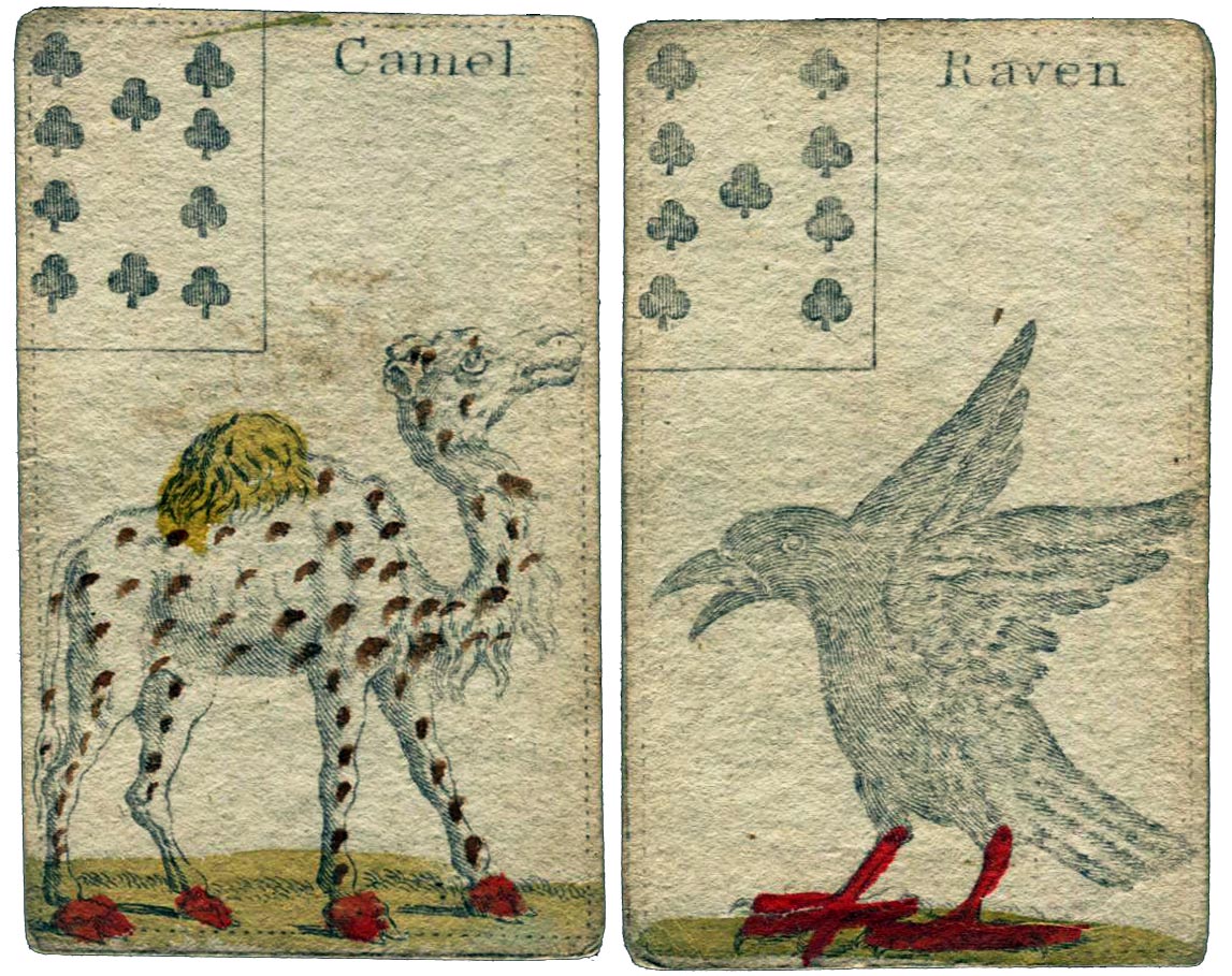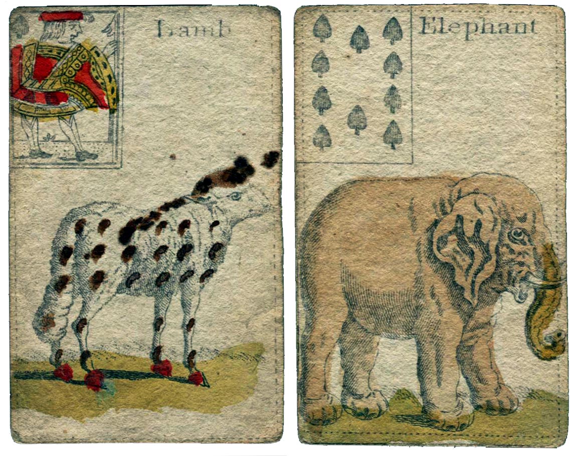 Animals have been a favourite theme on playing cards, from medieval Hunting packs, to Aesop’s Fables, to Animal tarots as well as Edwardian Farmyard Snap games.