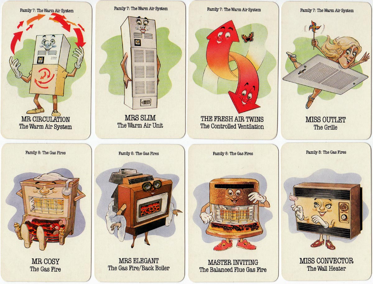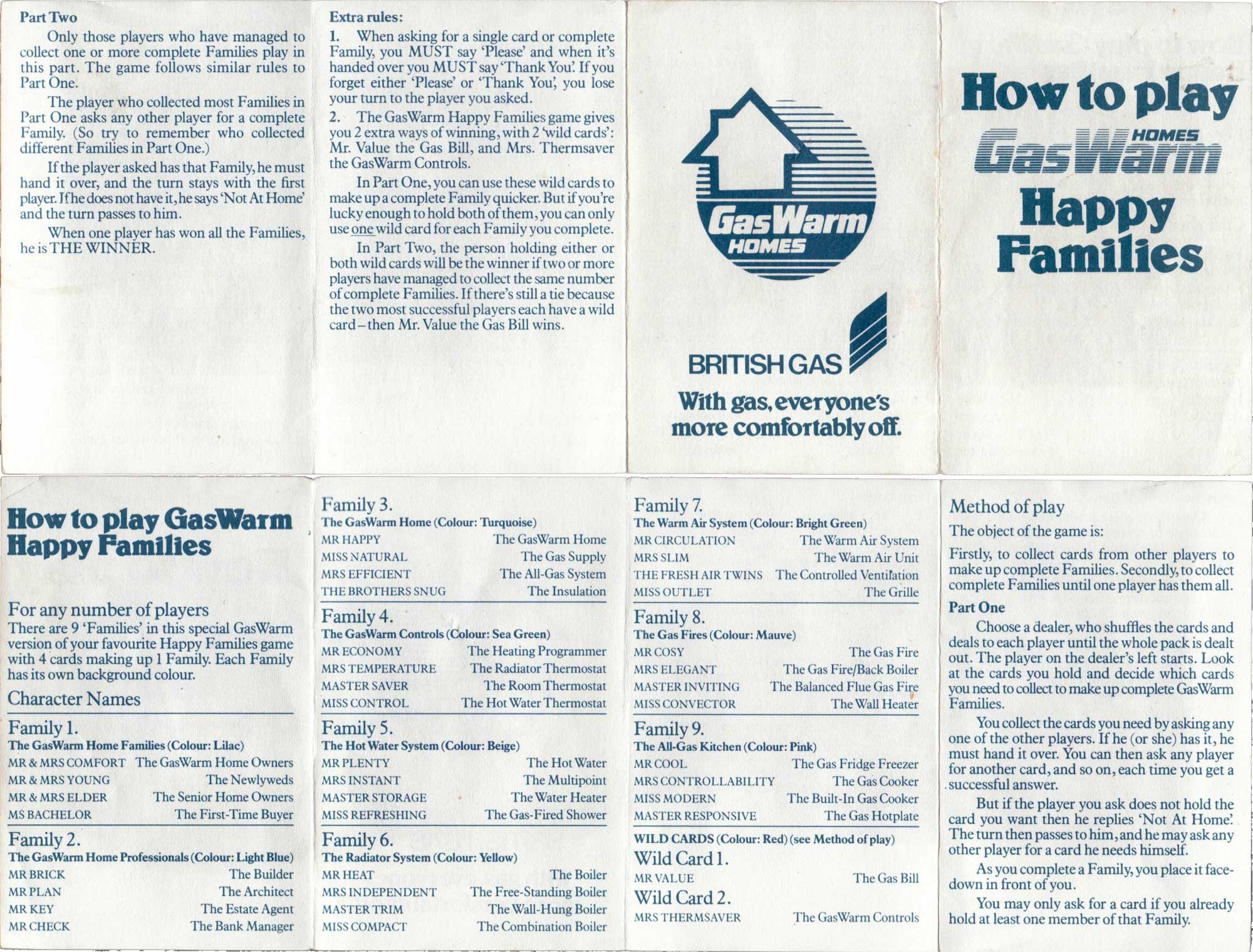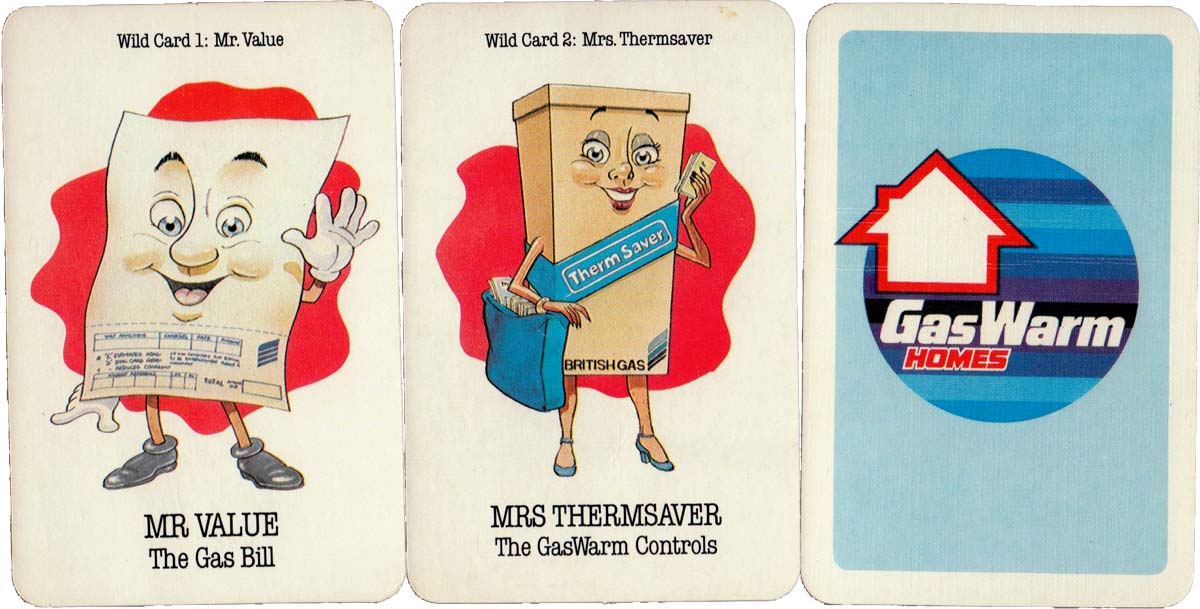 Gas Warm Homes Happy Families promotional card game published by British Gas, c.1980. The cards illustrate various home-owners along with the latest range of boilers, heaters and thermostats; the message being “With gas, everyone’s more comfortably off”. One of the 2 ‘wild card’ jokers is Mr Value, the Gas Bill. The object of the game is to collect cards from other players to make up complete families. See the Rules leaflet►