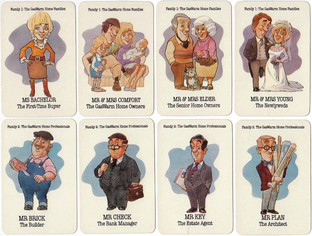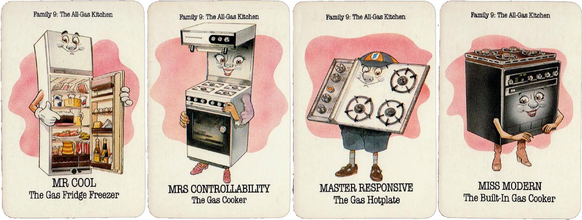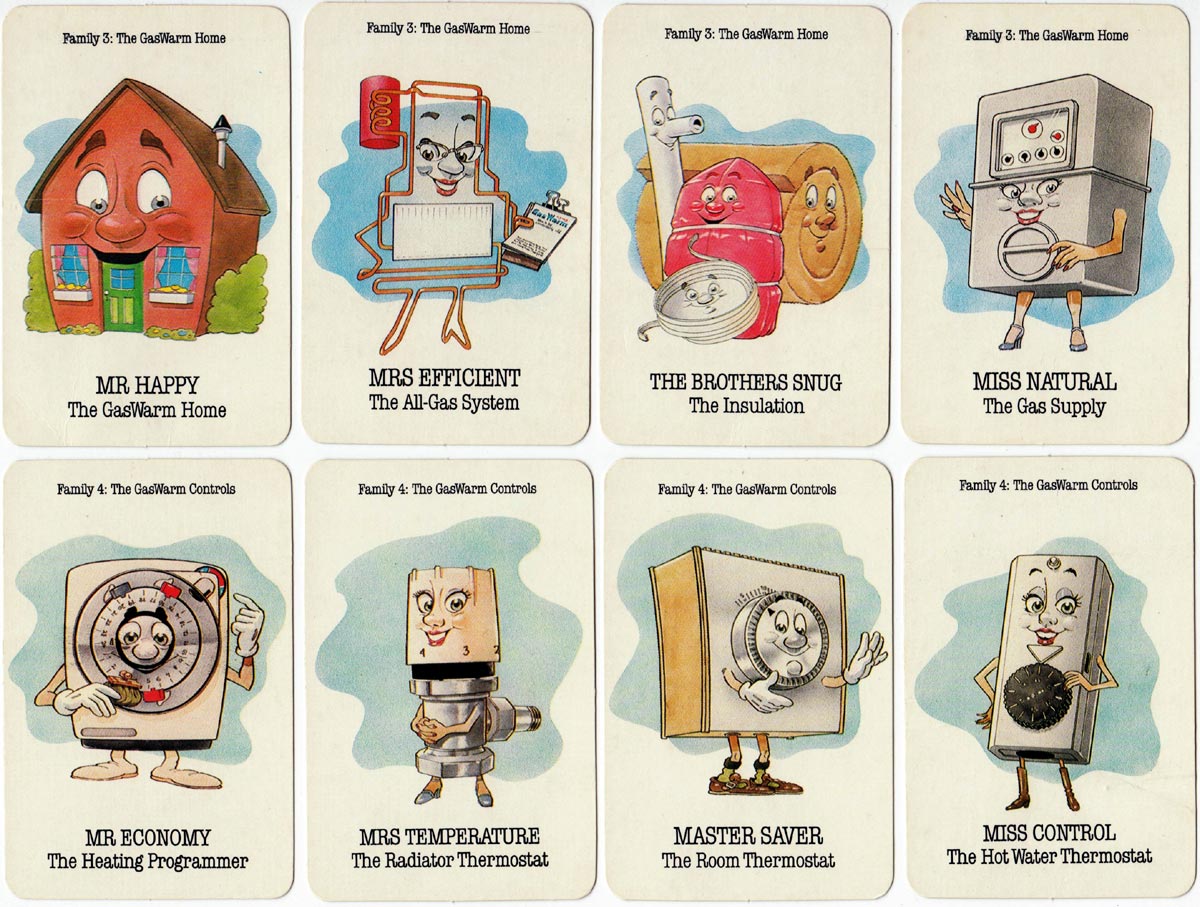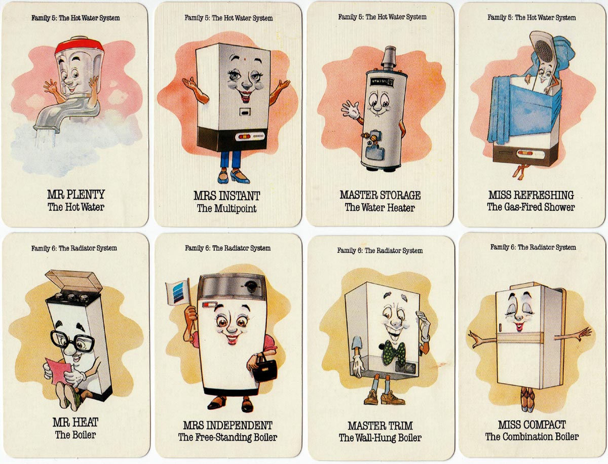 Gas Warm Homes Happy Families promotional card game published by British Gas, c.1980. The cards illustrate various home-owners along with the latest range of boilers, heaters and thermostats; the message being “With gas, everyone’s more comfortably off”. One of the 2 ‘wild card’ jokers is Mr Value, the Gas Bill. The object of the game is to collect cards from other players to make up complete families. See the Rules leaflet►