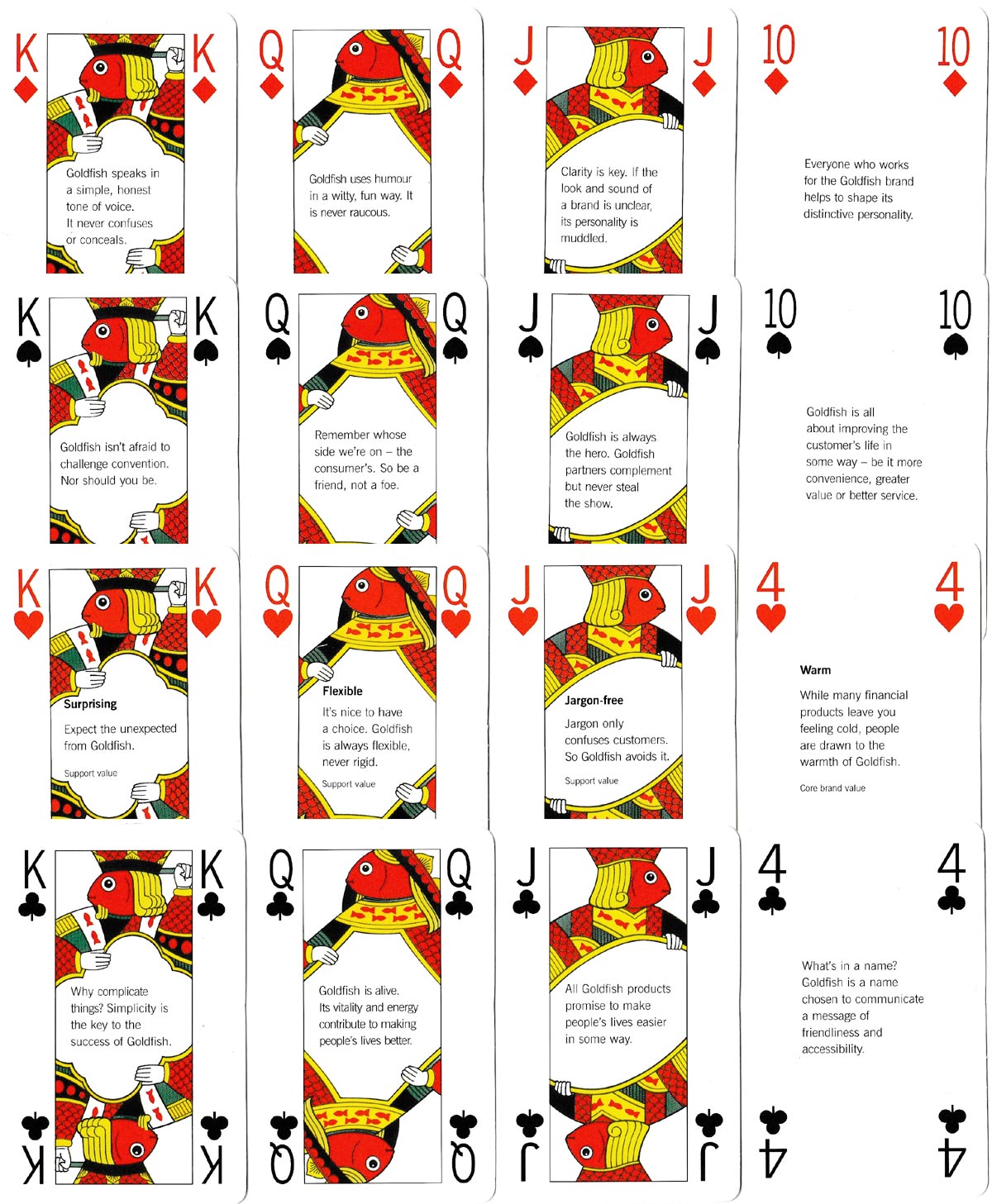 This pack has replaced the standard court cards with goldfish-headed characters, and all the cards (except the standard aces) have slick advertising slogans or brand values across the centre.