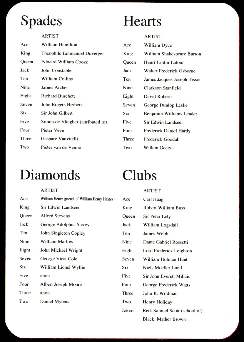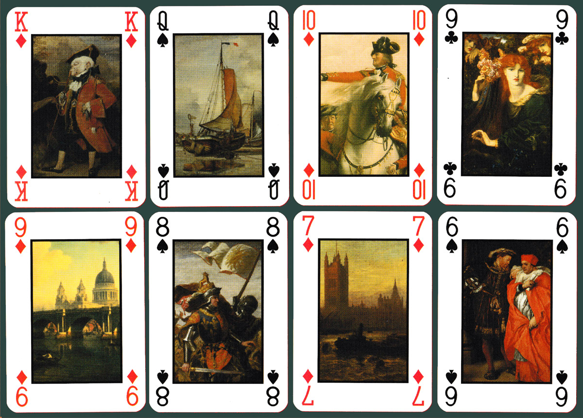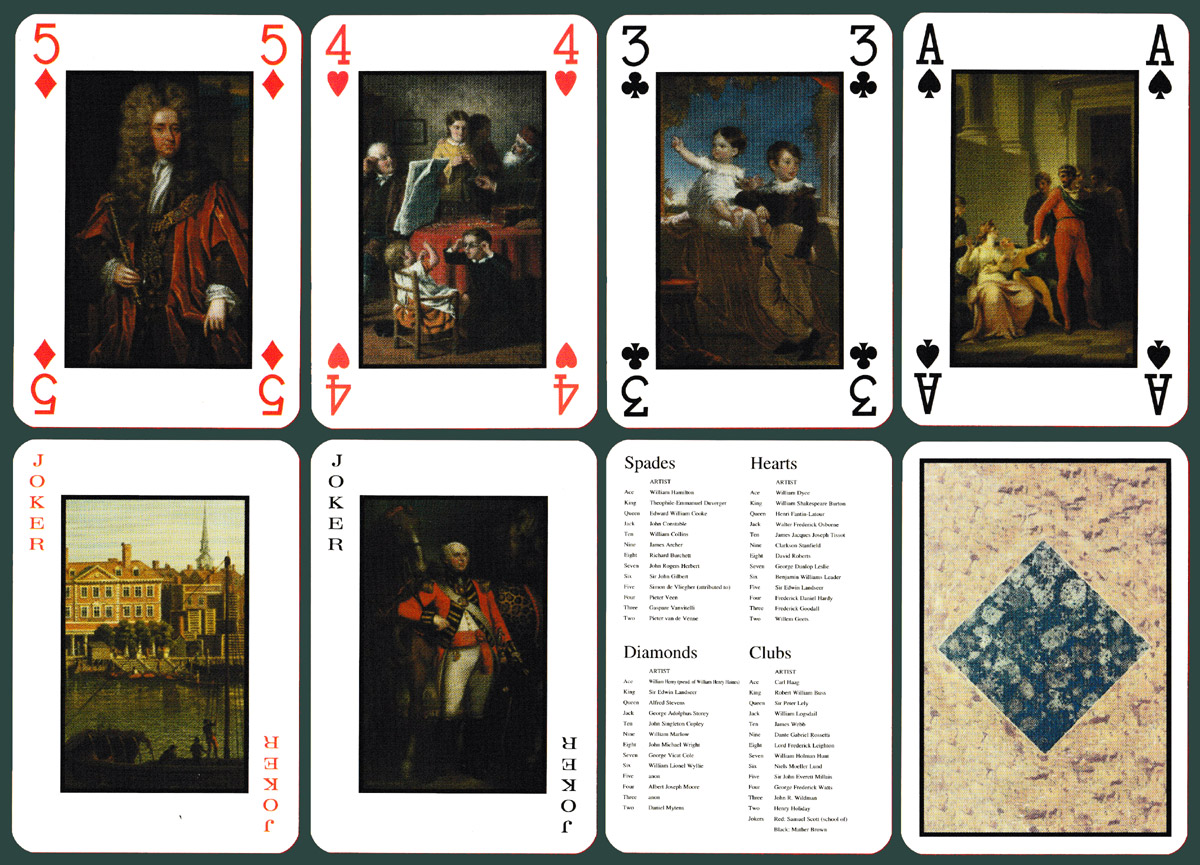 Above: Guildhall Art Gallery playing cards published by the Corporation of London, c2002. Printed by Carta Mundi, Turnhout, Belgium. 52 cards + 2 Jokers + 1 extra card in tuck box. Size: 67 x 97 mm.