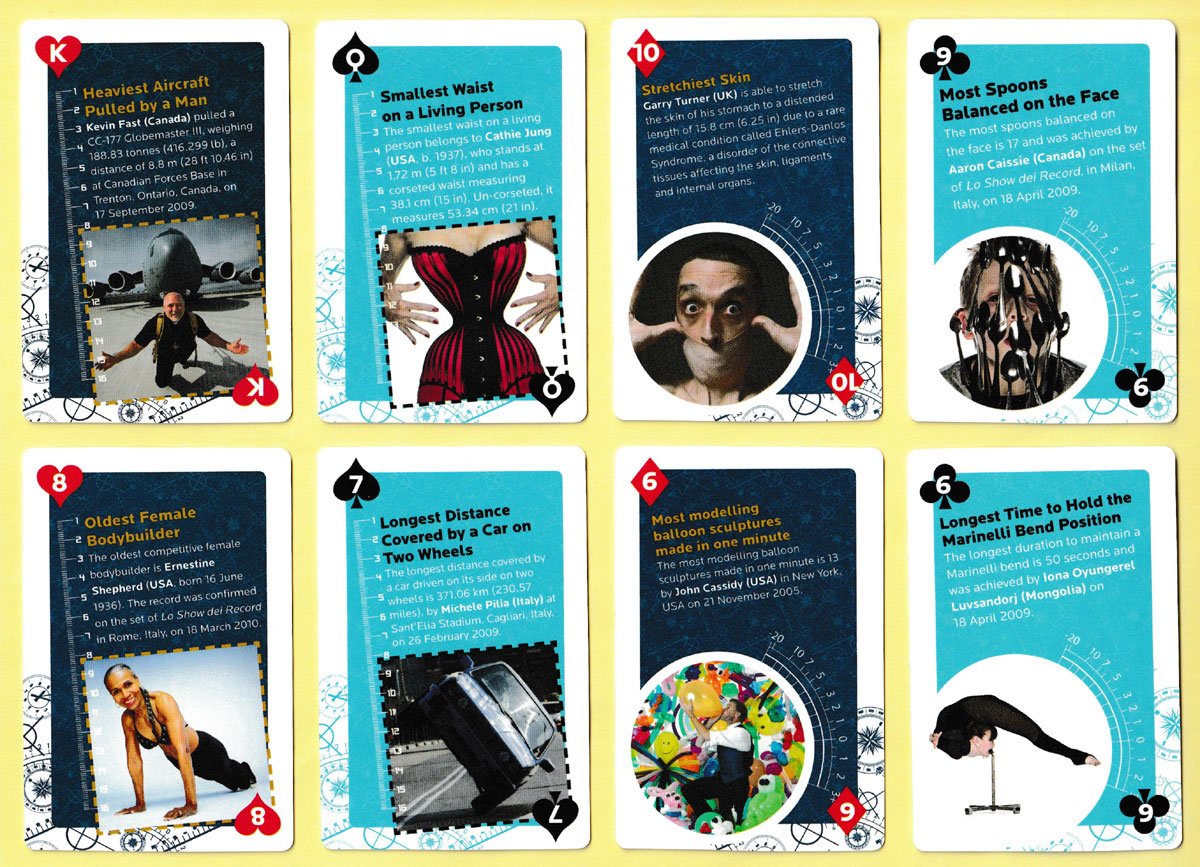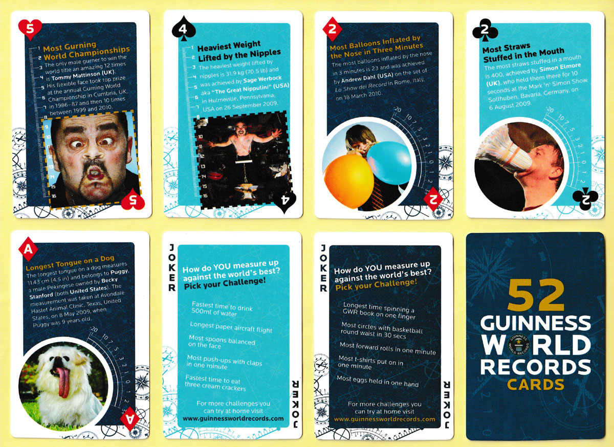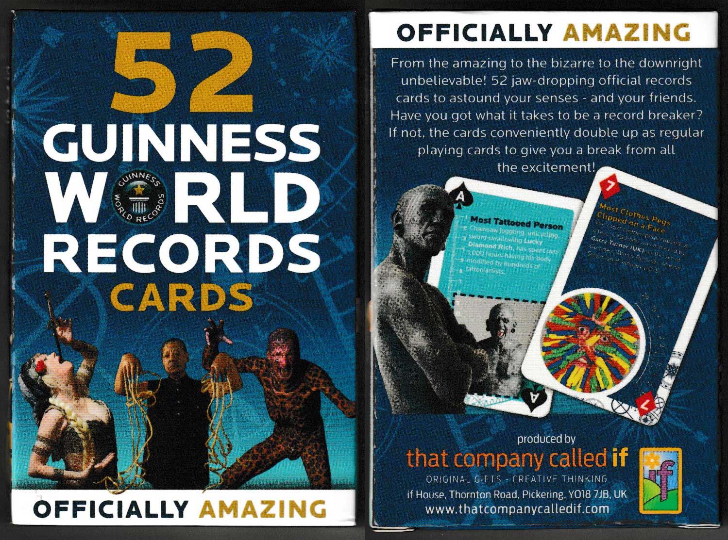 Above: 52 Guinness World Records Cards published by if, Pickering, UK, 2011. Cards made in China. 52 cards + 2 Jokers in tuck box. Size: 58.5 x 88 mm. © 2011 Guinness World Records Limited.