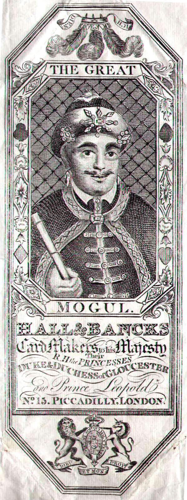 ◄ Left: Hall & Bancks outer playing card wrapper for the "The Great Mogul" brand made at their No.15 Piccadilly, London premises, c.1823. The wrapper bears the inscription "CARD MAKERS TO HIS MAJESTY THEIR R.H THE PRINCESS DUKE & DUCHESS OF GLOUCESTER AND PRINCE LEOPOLD".