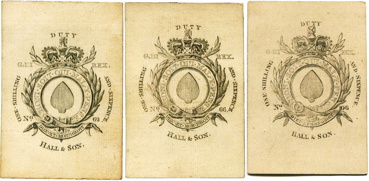 Above: Hall & Son George III garter duty aces of spades, each with one shilling and sixpence duty and their respective die numbers, c.1810.