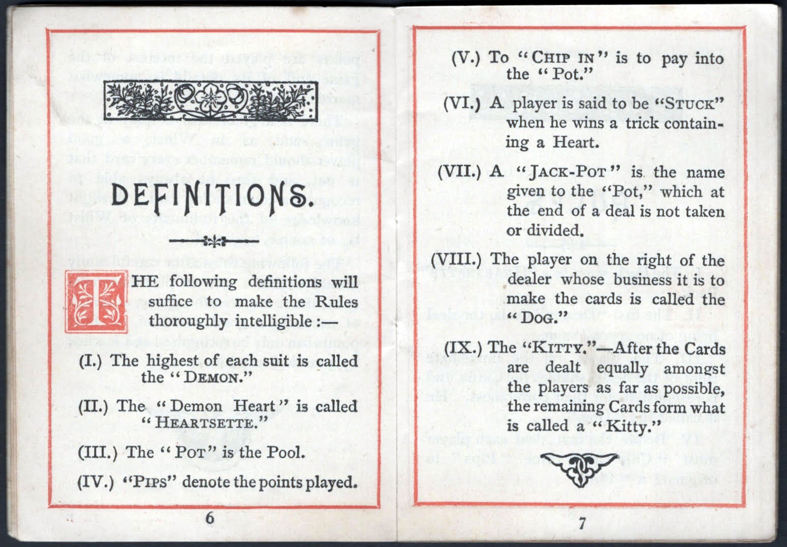 According to the booklet, the game can only be played with a Heartsette pack, the "Demon" of each suit being the highest and the Ace the lowest, the other cards ranking as in Whist. The object of the game is to discard all Hearts and so arrange as not to take any trick containing a Heart. Three, Four or Five persons can play the game, every player being for themself and against all others. It is a non-gambling game and if points are played the interest of the game and its details is somewhat marred more►