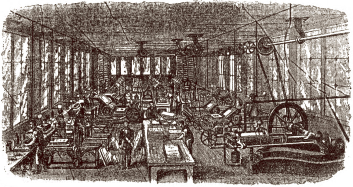 Overhead drive shafts and belts deliver power to the machines from a steam engine in a boiler room. A foreman can be seen at centre-left foreground while skilled operatives mind the machinery. Artisan craftsmanship has long been replaced by mechanisation and costly machinery in an industrialised environment where progressive enterprise, sound commercial principles and international reputation are valued. During the 19th century production from workshops like this was shipped worldwide, including India, the Far East and the Colonies.