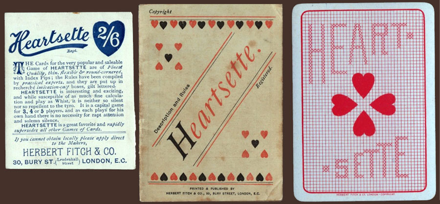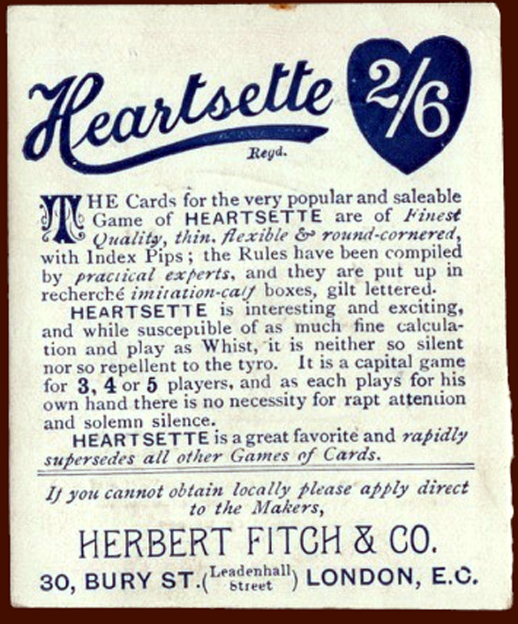 In the 1890s Messrs Herbert Fitch & Co were winning over business to the use of advertising. As an incentive, the firm had a fine assortment of artistic blocks available, suitable for embellishing catalogues, circulars, window cards, price lists and all sorts of business advertisements. And they also promoted the very popular and saleable game of Heartsette with rounded corners and indices, in faux-calfskin boxes with gilt lettering, price 2/6d.