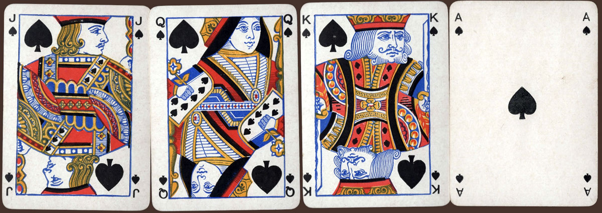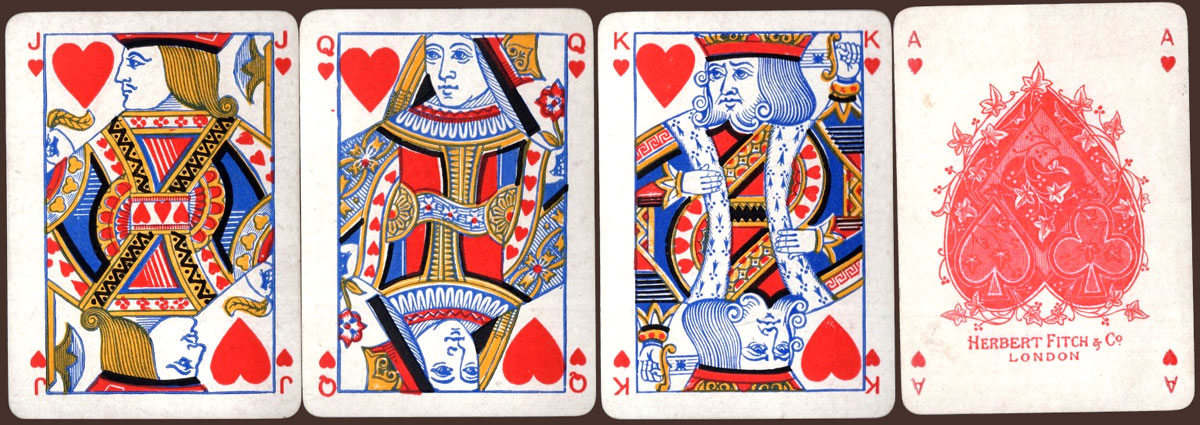 Above: special Heartsette pack (registered & copyrighted) published by Herbert Fitch & Co, 1893, who were promoting the game - very like Black Maria. The Ace of Spades is plain, but there is a special Ace of Hearts instead. The 12 court cards are the standard Goodall faces. 52 cards + 20-page booklet + smaller card