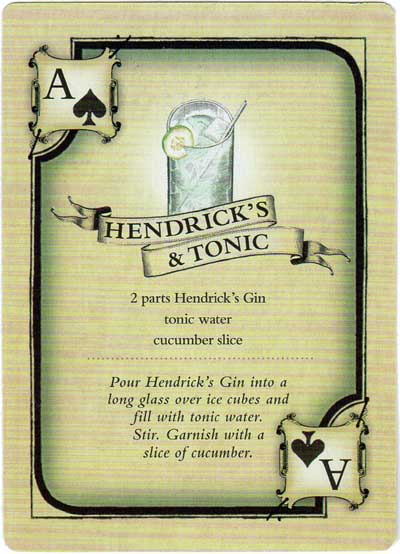 A nice advertising deck for Hendrick’s Gin, the juniper based spirit which is distilled and bottled in Scotland. The aces and joker cards have a selection of botanical cocktail recipes, offering a variety of flavours, which every good bartender will know.