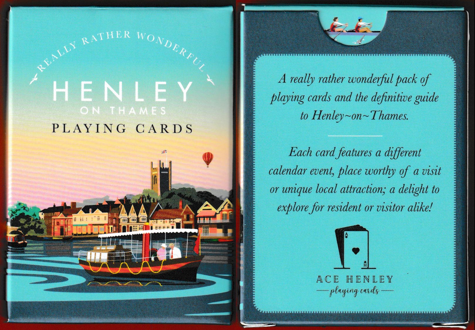 Above: Henley-on-Thames playing cards published by Ace Henley. Designed and printed in the UK, 2023. 52 cards + 2 wild cards + 1 extra card in tuck box. Size: 63 x 88 mm. © Ace Henley.