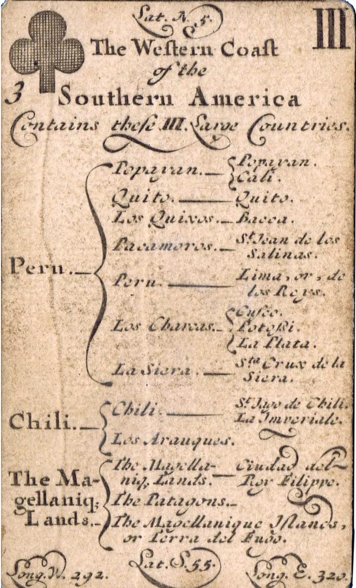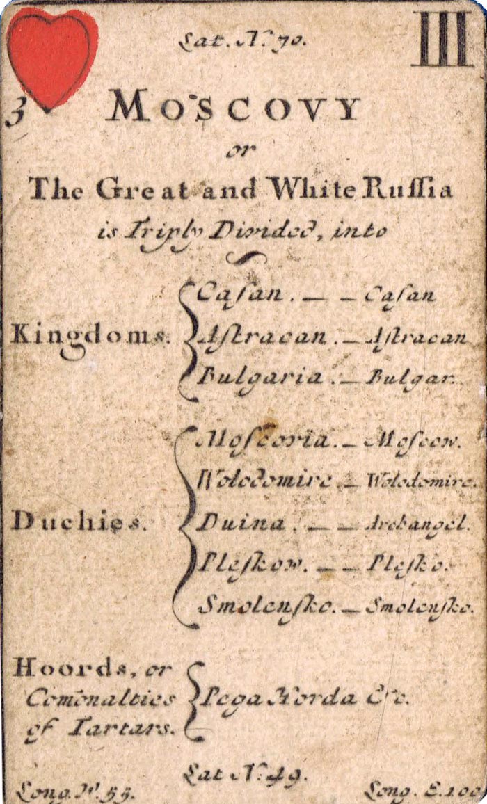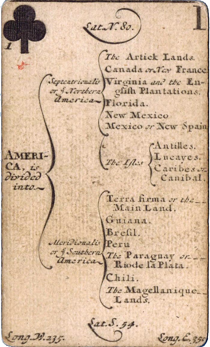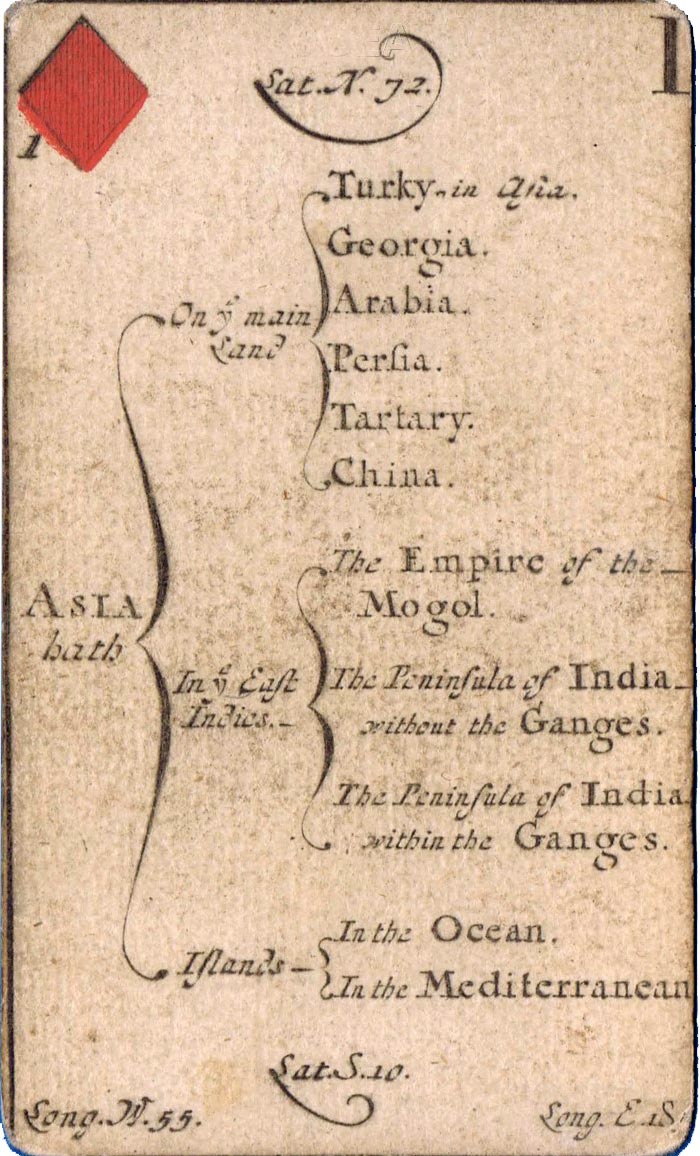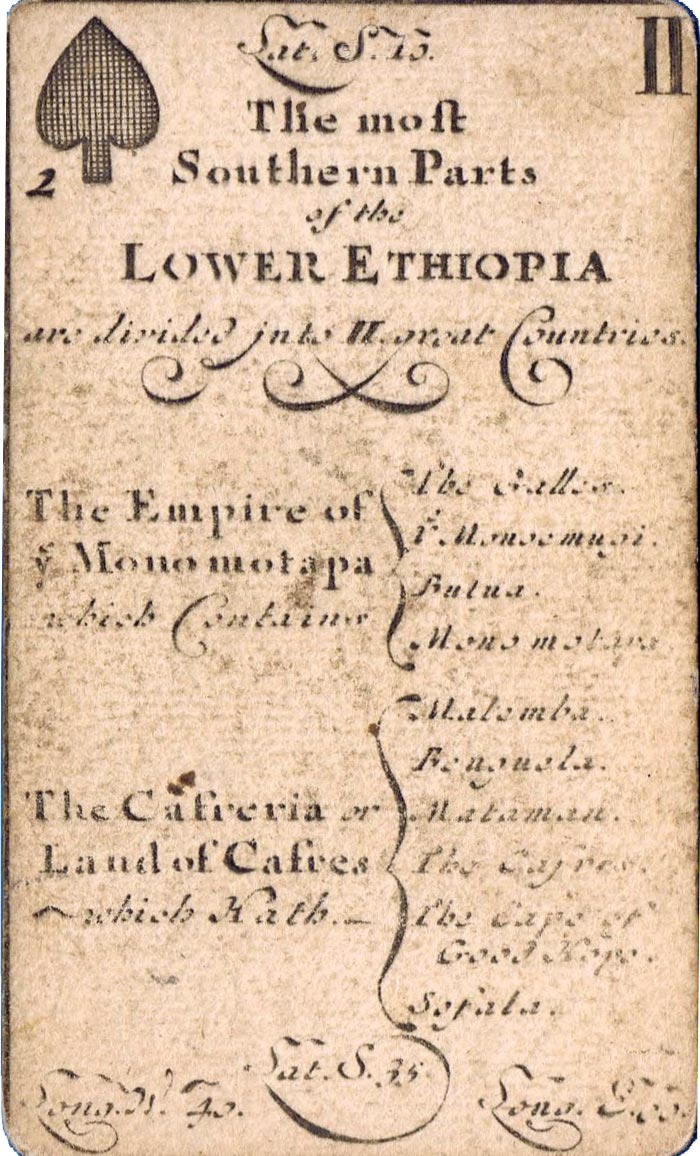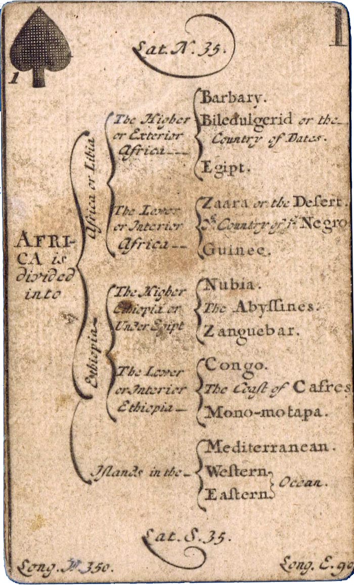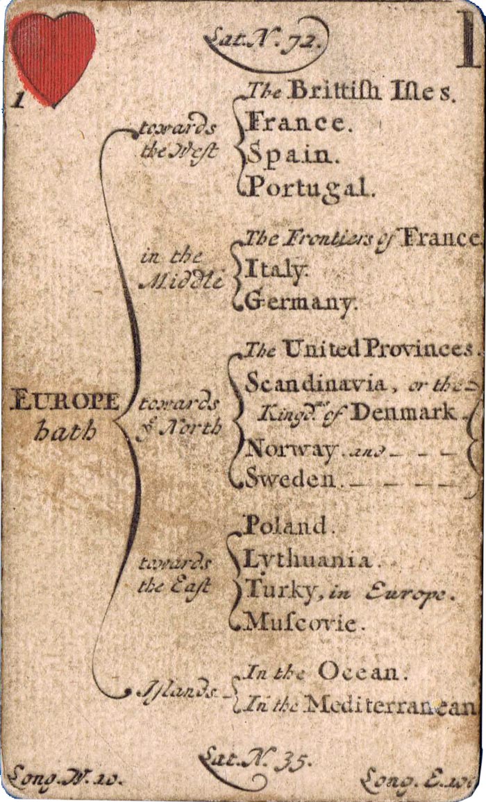 The greater portion of each card is occupied by a geographical account of various countries, including longitude and latitude, a systematic classification of which is given on the ace of each suit. The court cards have a central cartouche depicting kings, queens, ethnic groupings and dignitaries of the period. Hearts represents Europe, spades = Africa, diamonds = Asia and clubs = America. Similar sets were produced in France, Germany and Italy at around this date.