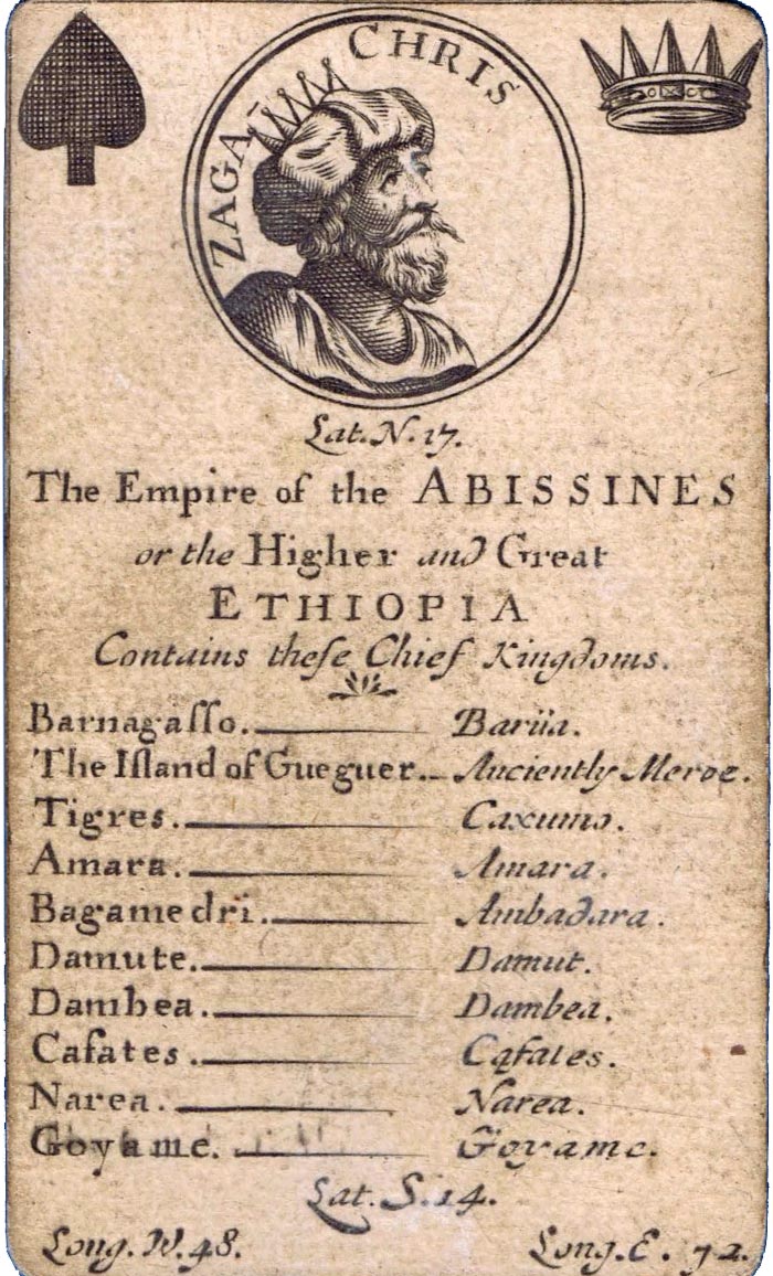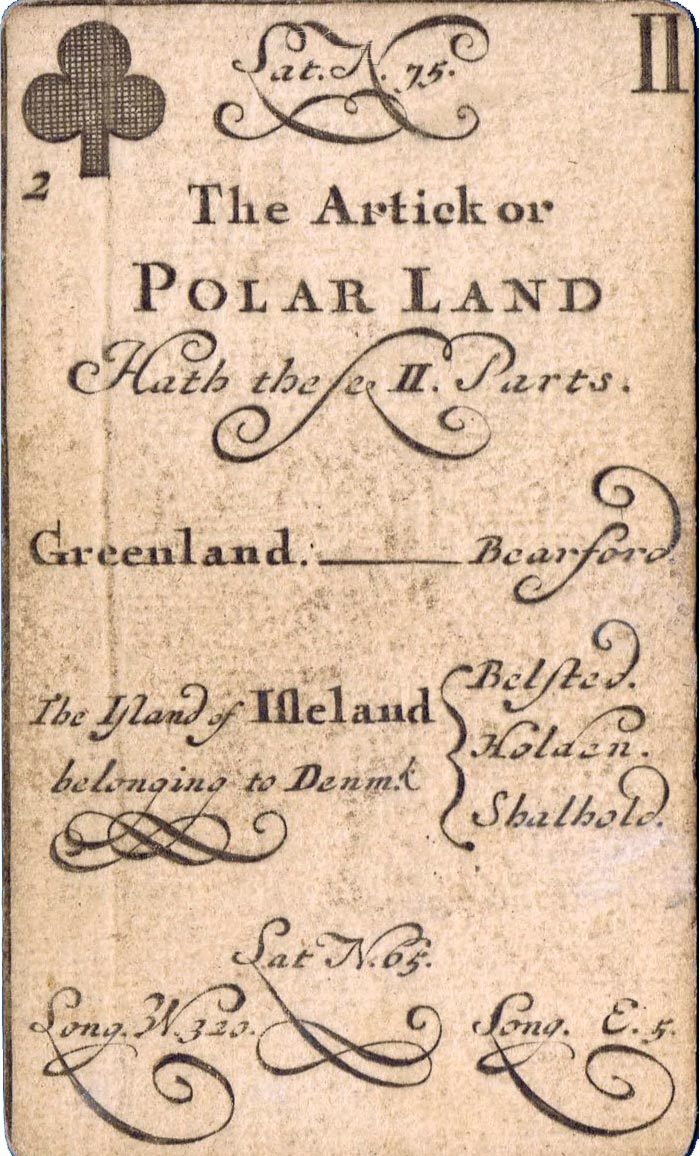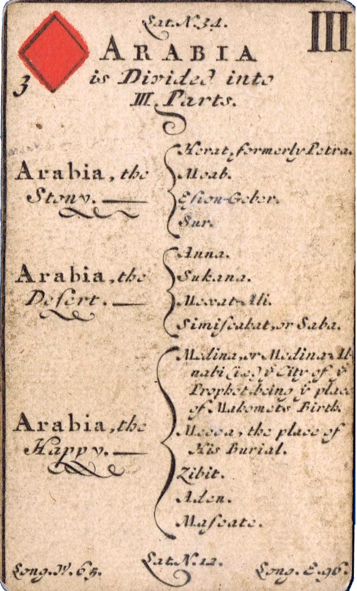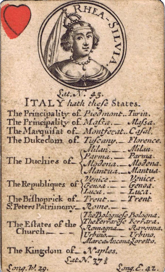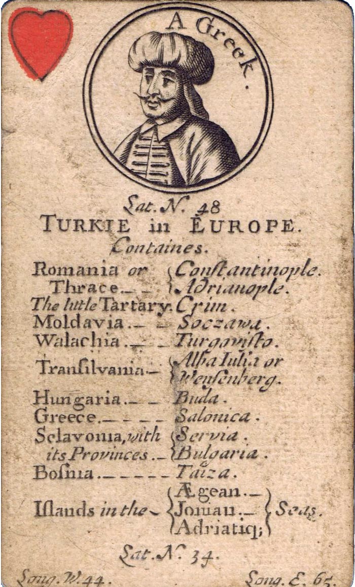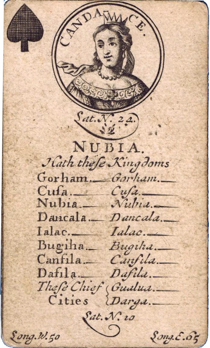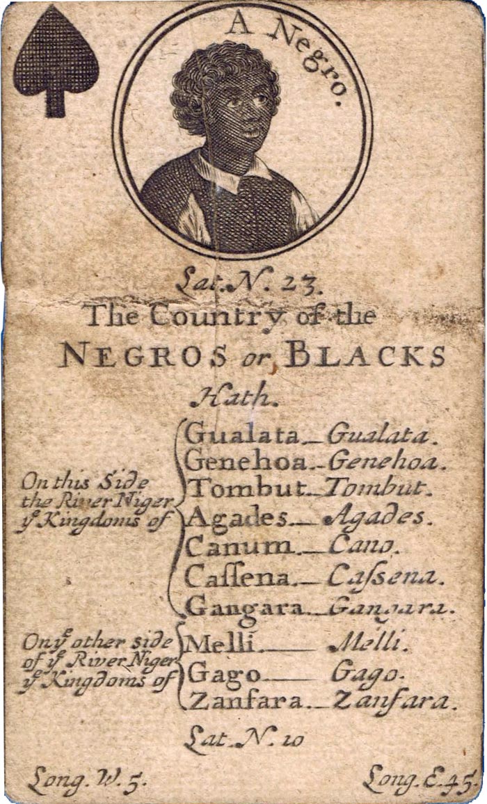 The greater portion of each card is occupied by a geographical account of various countries, including longitude and latitude, a systematic classification of which is given on the ace of each suit. The court cards have a central cartouche depicting kings, queens, ethnic groupings and dignitaries of the period. Hearts represents Europe, spades = Africa, diamonds = Asia and clubs = America. Similar sets were produced in France, Germany and Italy at around this date.