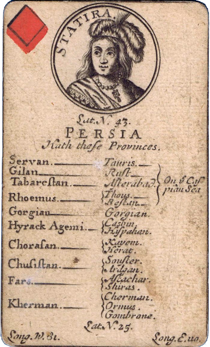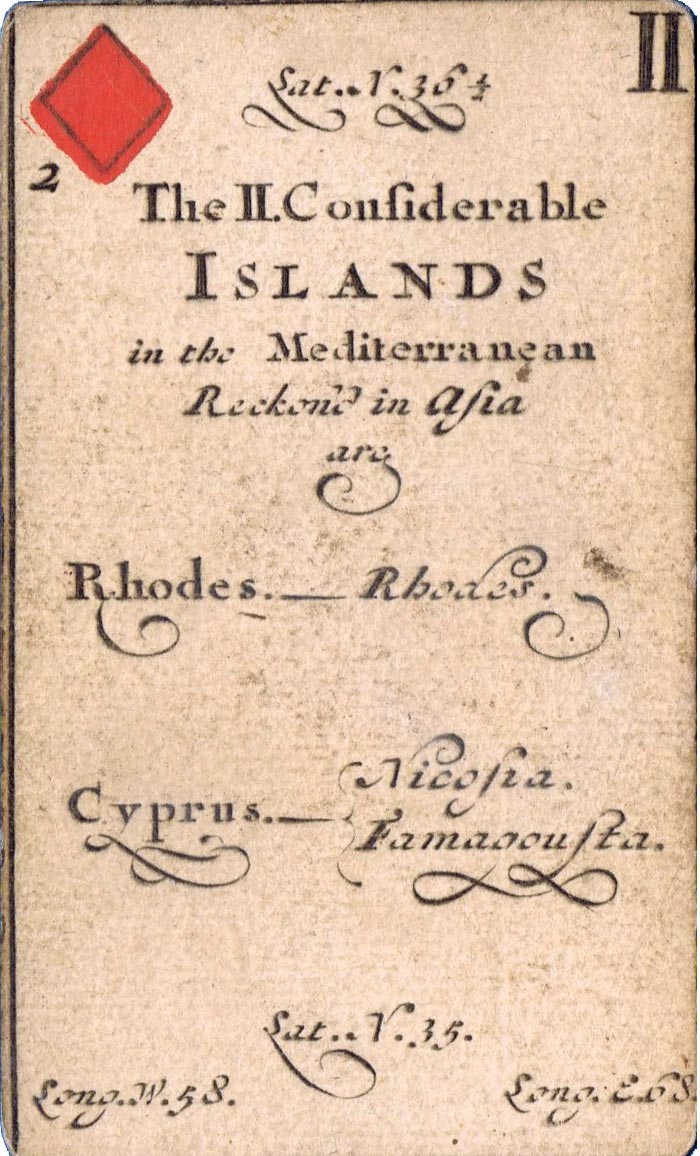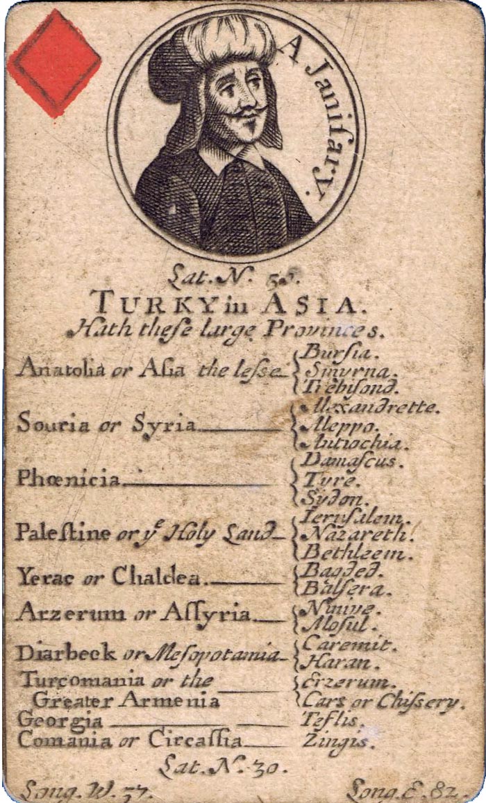 Geographical and other instructional playing cards were becoming a trend during the seventeenth century, often showing maps or, as in this case, a compendium of information. In this example the cards were advertised as “used for the recreation in all our English Games, so they are useful to all ingenious persons for obtaining a system of universal geography, which, by this contrivance, is rendered pleasant and familiar to all capacities”.