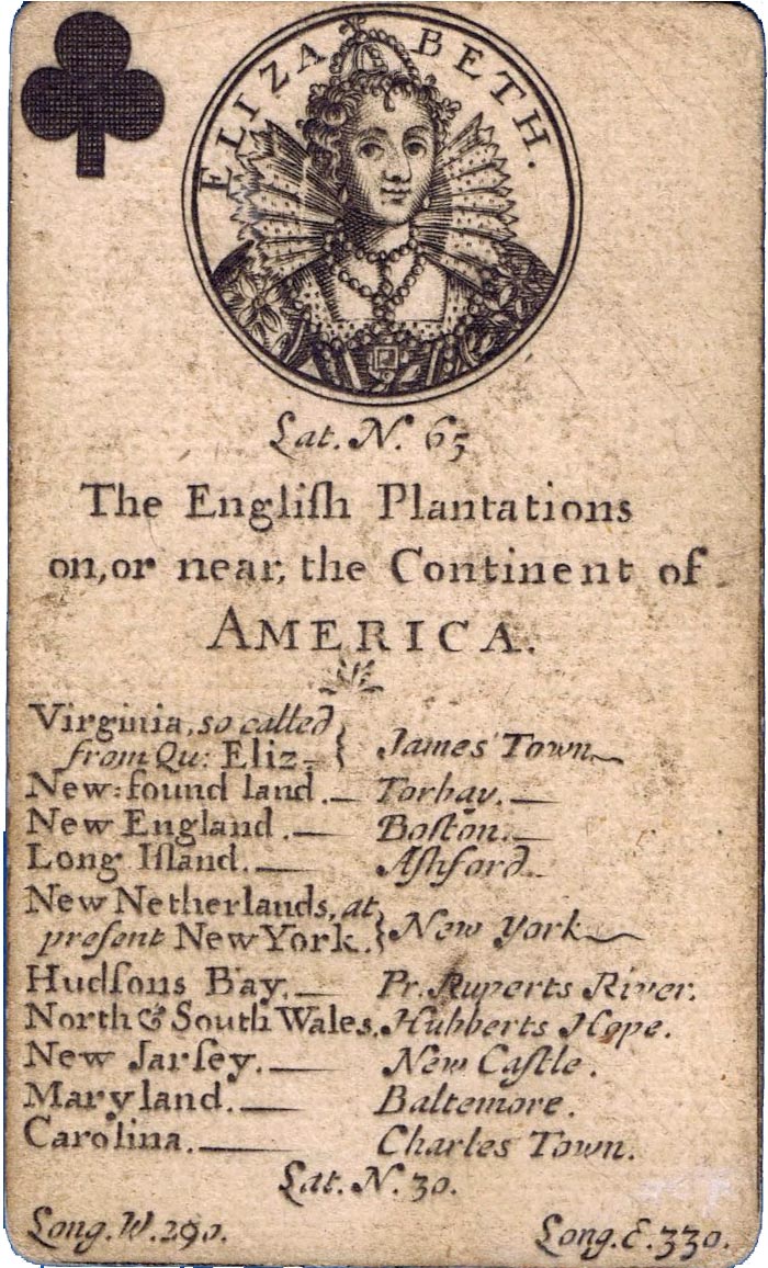 Above: Geographical playing cards sold by Henry Brome, second edition, c.1682. 52 engraved cards. The cards have both Roman numerals in the top right and Arabic numerals under the suit signs on the upper left. The suit signs are hatched engraving for the black suits and outline pip symbols with colour stencilling for red suits. The kings have a crown engraved in the top right corner. The copper engravings are by F. H. van Hove who was born in Haarlem, Holland, c.1630 and who appears to have worked as a portrait engraver in London. The cards were made “by Tho Poole, first Cardmaker of England”.