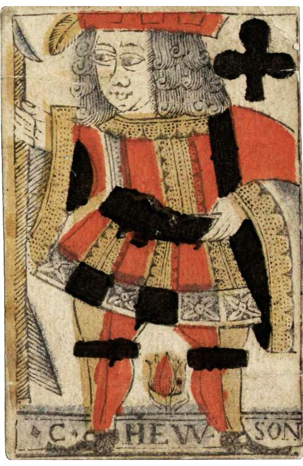 However, there may never have been such card-maker. There are no references to anyone of that name in the Worshipful Company records, no adverts referring to him, nothing. It seems to be a name given to the Jack of Clubs in the wake of a non-standard pack of the late 17th century in which the JC is the historical figure, Cobbler Hewson, the regicide [here].