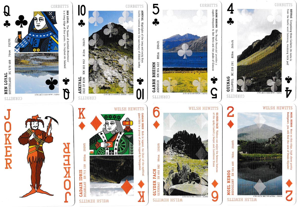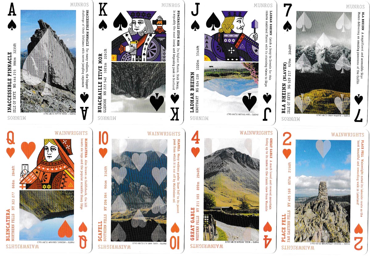The spades show the Munros (the mountains in Scotland over 3000 feet high); the clubs depict the Corbetts (Scottish hills between 2500 and 2999 feet high with a drop of at least 500 feet on all sides); the heart suit is devoted to the Wainwrights (the English peaks or fells described in Alfred Wainwright's seven-volume Pictorial Guide to the Lakeland Fells); and the diamonds portray the Welsh Hewitts (hills in Wales over 2000 feet high with a drop of at least 98 feet all round).