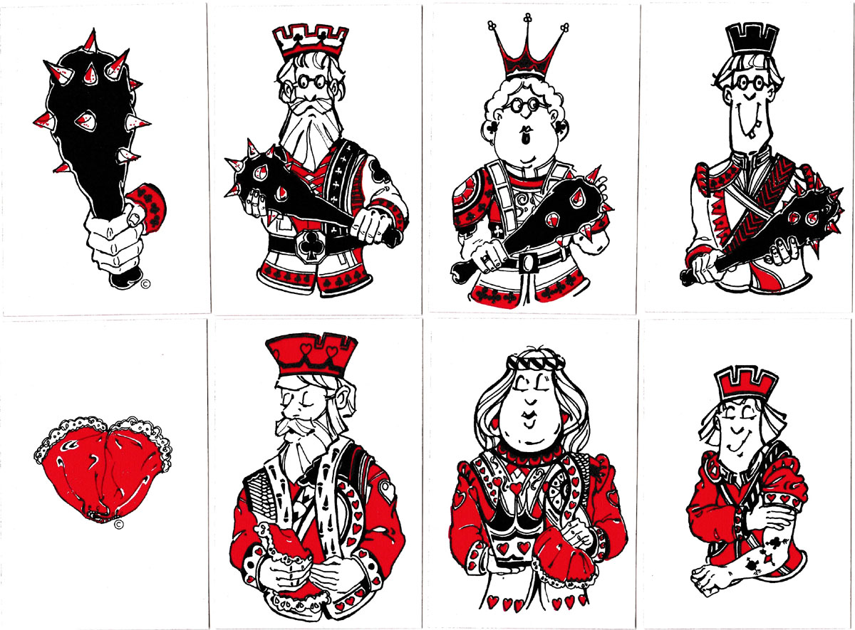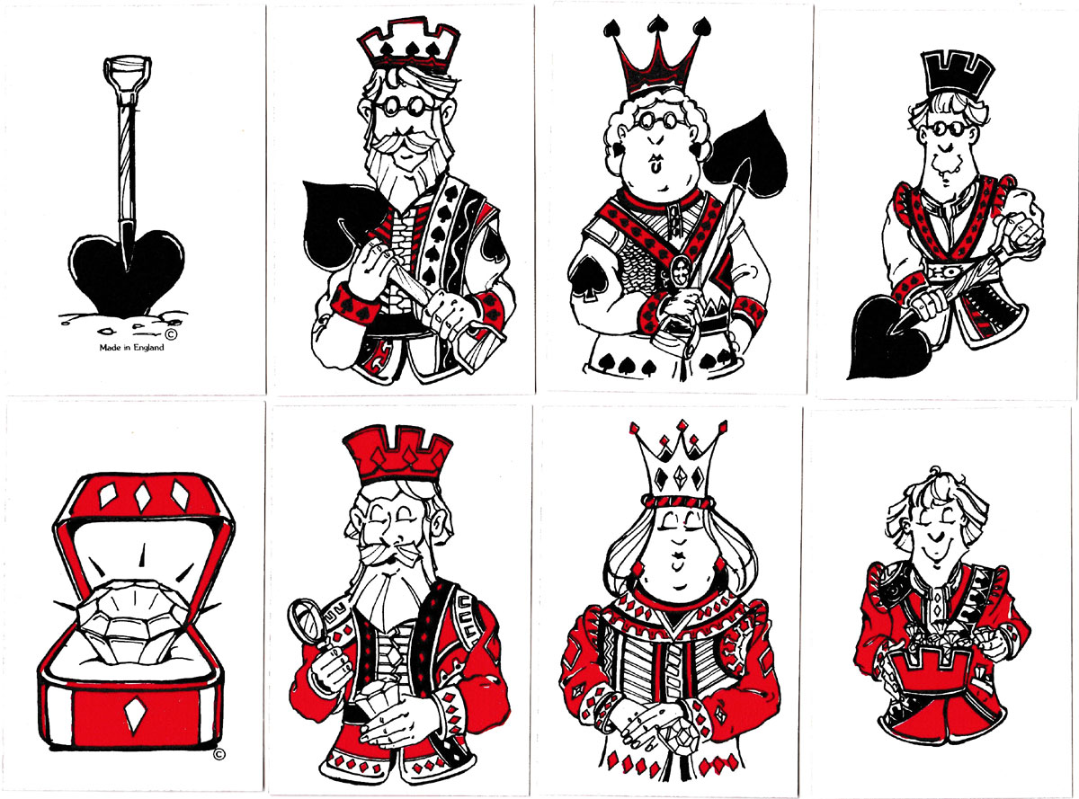 The spade court cards are shown holding garden spades; clubs literally holding clubs; diamond courts holding diamonds with their sharp, sparkly edges; hearts were left to the discretion of the artist, Nicholas Thompson-Moore. He depicts the ace of hearts as a closely drawn pair of French knickers, the jack shows the three broken hearts of the other suits tattooed on his left arm, and “the king and queen trying to be a little bit discrete having been caught red-handed as it were”. Particularly noteworthy is the unusual formation and irregular pattern found on the pip cards. There are 7 different jokers.
