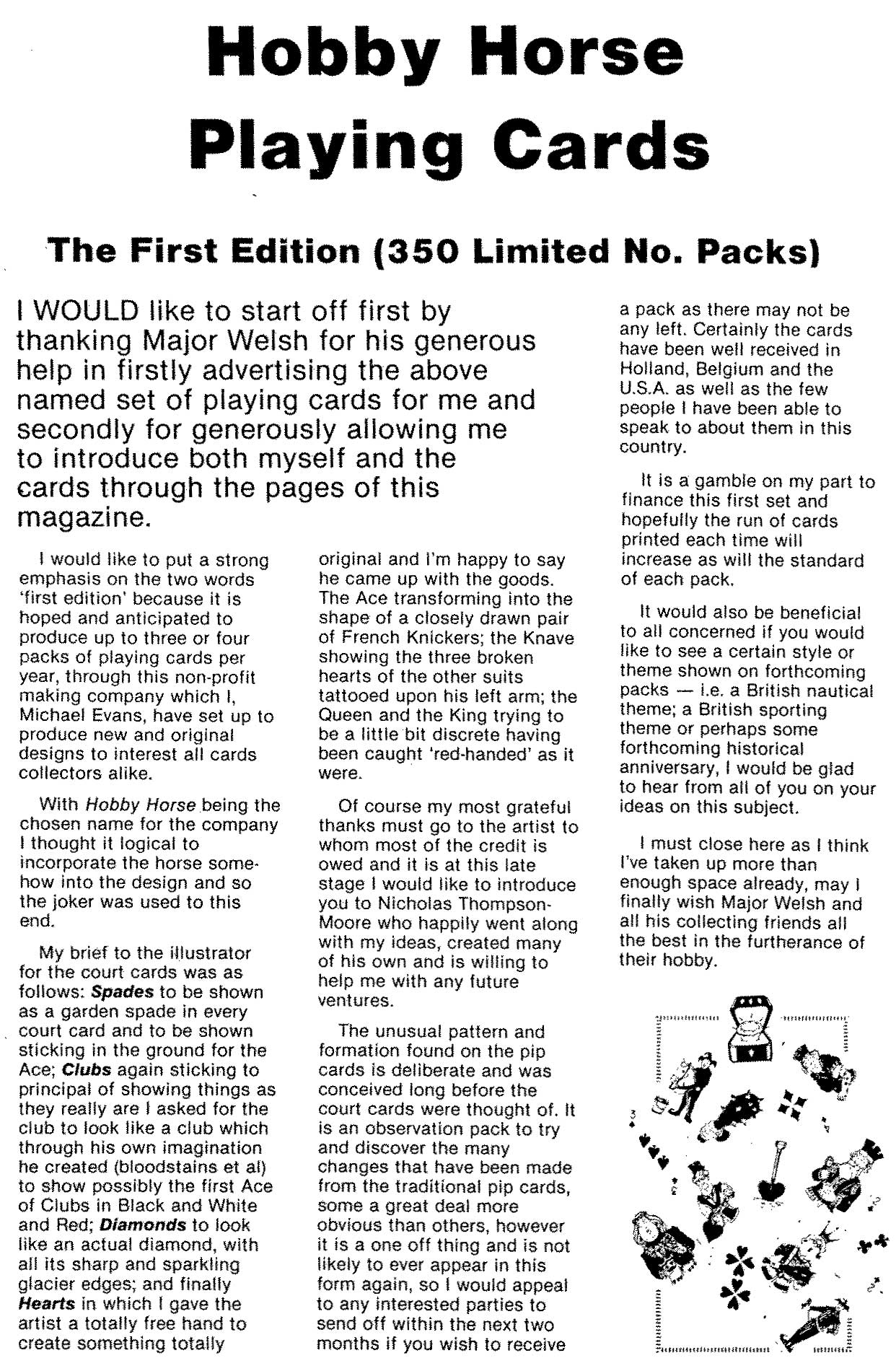 Hobby horse playing cards produced by Michael Evans in a limited edition of 350 packs, 1986.