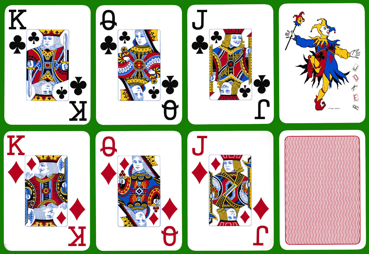 On the tuck box, these are described as “broad size cards suitable for black jack”, Blackjack (to give it its more usual spelling) being the most widely played casino banking game in the world. What makes these cards different and special is first and foremost the red ink that was used in the printing. This was a shade of red considered to be easier on the eye under the artificial lights normally found in clubs and casinos than the red traditionally used. It is darker, approaching crimson. A version of AGMüller’s standard English pattern has been used for the court cards. The Joker was designed by Chrissie Roberts. Produced with red or blue patterned backs. See the box►
