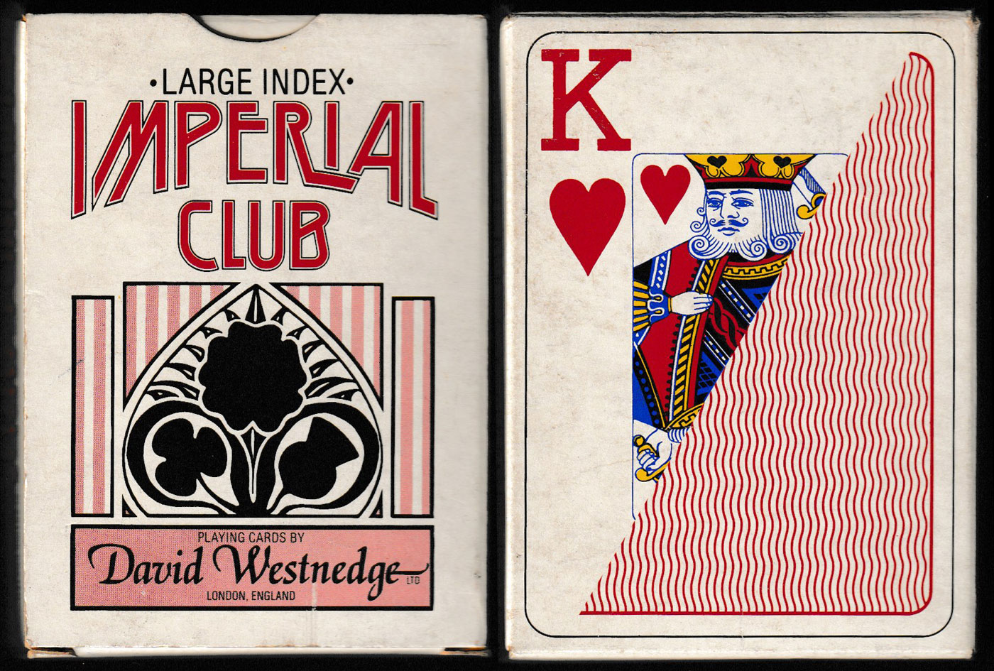 Above: Imperial Club playing cards made by AGMüller, Neuhausen am Rheinfall, Switzerland, for David Westnedge Ltd, London, UK, 1982. 52 cards + 3 (identical) Jokers in tuck box. Size: 63 x 88 mm.