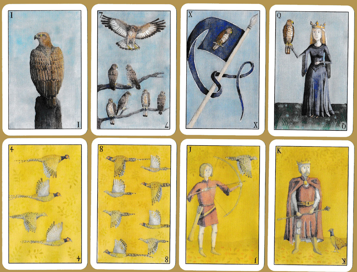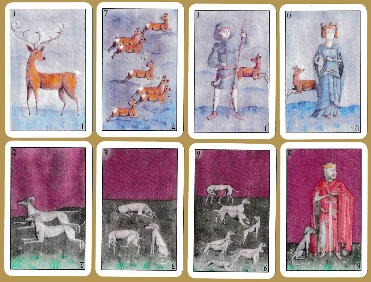The suits are easily distinguished not only by the animals appearing on the cards, but also by the background colours, and, for the court cards, by the colours of the clothing: hawks are on sky blue with navy blue clothing; hounds are on maroon and dark green with scarlet clothing; deer are on lilac with turquoise clothing; and pheasants are on yellow-orange with maroon clothing. The tens are marked with the Roman numeral X, and illustrated with banners. There are two extra cards which can serve as jokers, and one further card explaining the inspiration for this pack. See the box