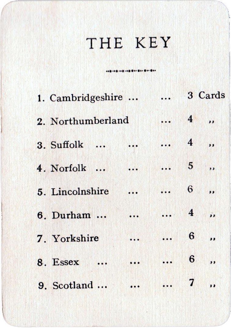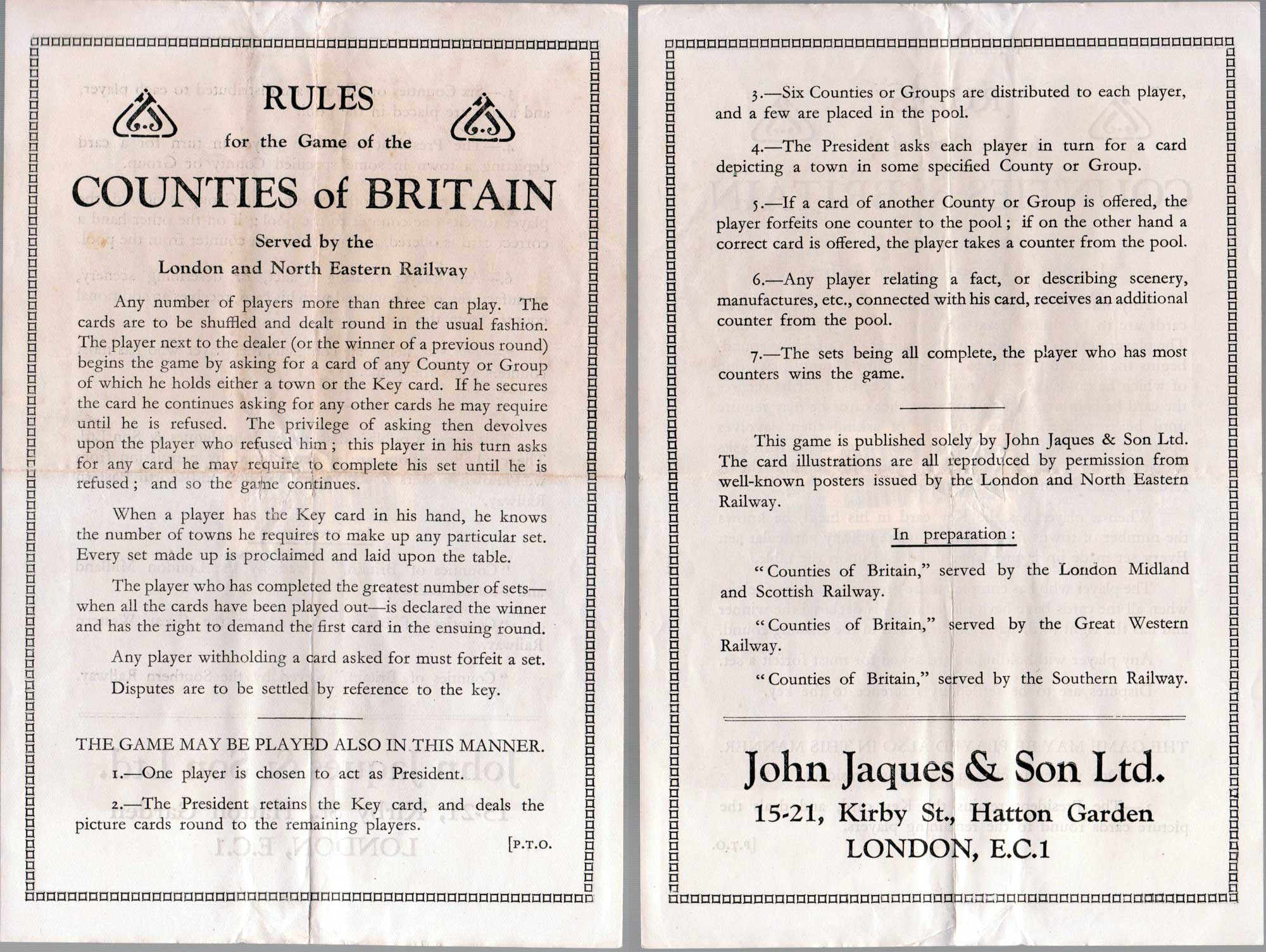 The Game of the Counties of Britain served by the London and North Eastern Railway, published by John Jaques & Son Ltd. c.1930. The pack contains nine sets of cards which are listed on the Key card. The picture cards are illustrated with reproductions of famous railway posters issued by the LNER. See the Rules►