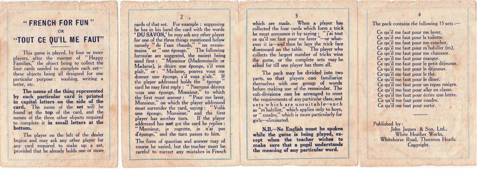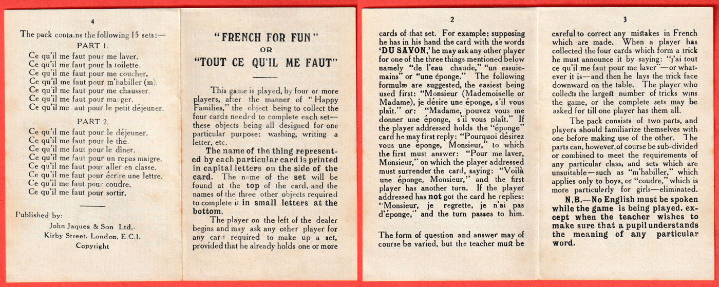 Above: cards from French for Fun published by John Jaques & Son Ltd., White Heather Works, Whitehorse Road, Thornton Heath. Second (wartime) edition c.1942. 60 cards in slip-box + rules.