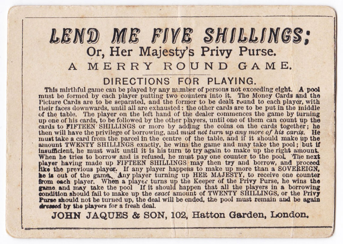 Above: Lend Me Five Shillings; or, Her Majesty’s Privy Purse by John Jaques & Son, c.1875. Two missing cards have been faked. The reverse is plain blue.