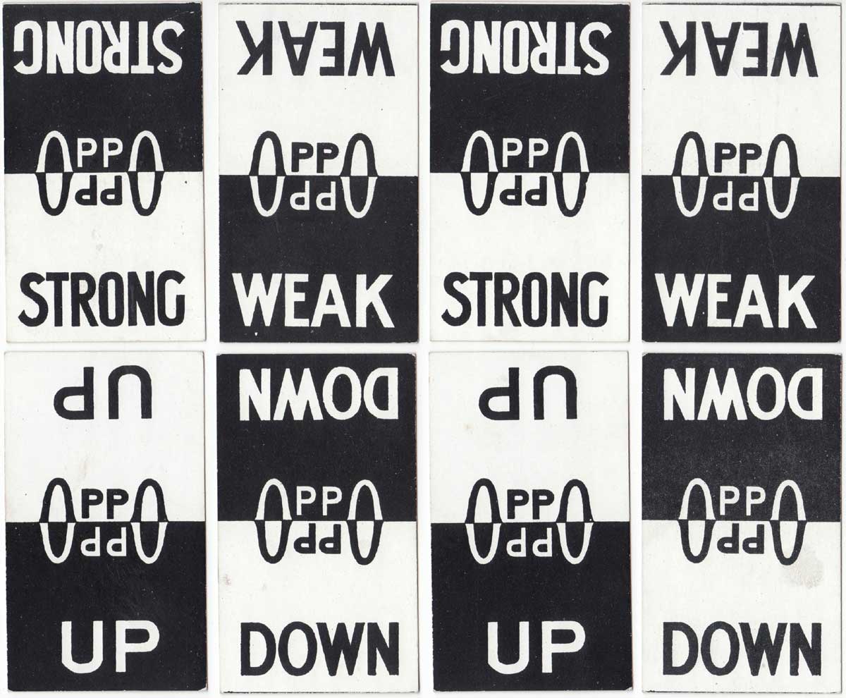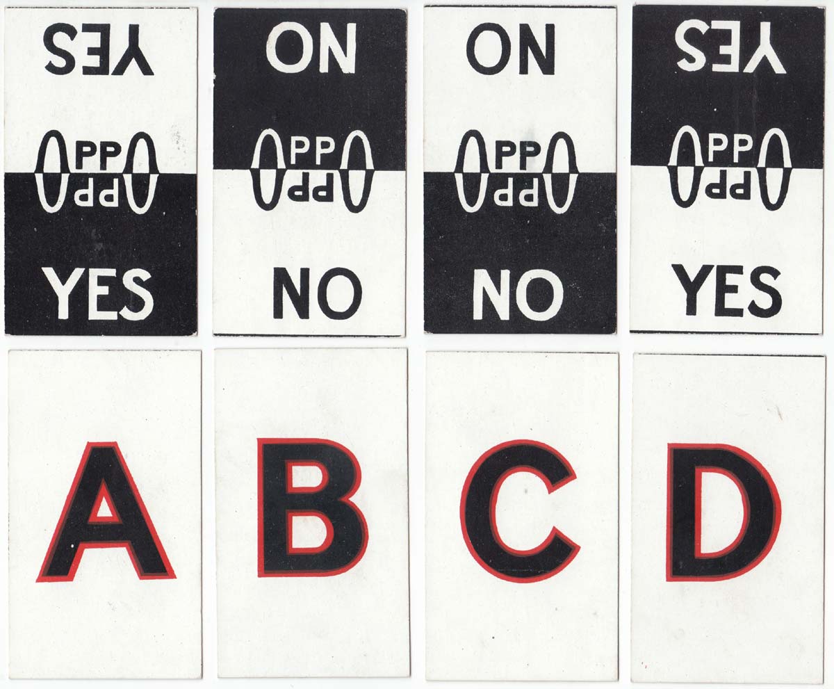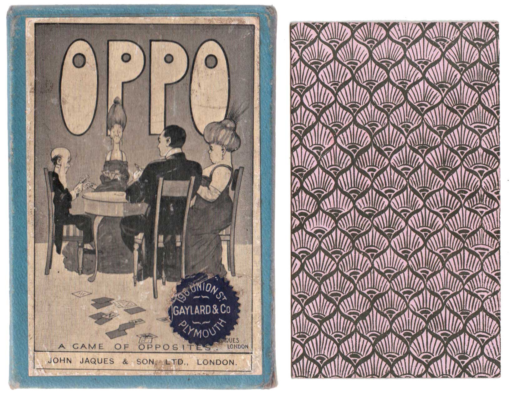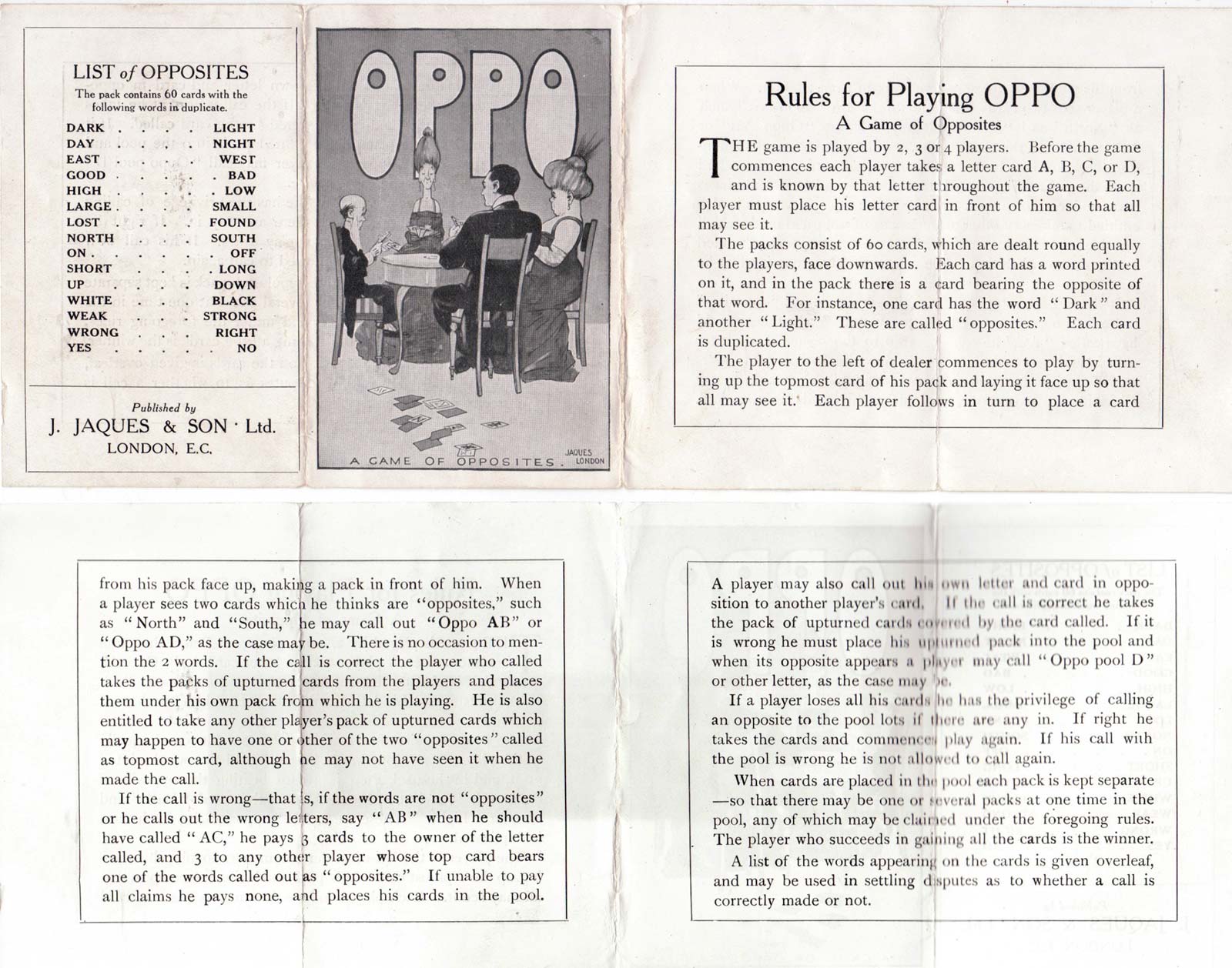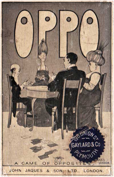 Oppo, a game of opposites, published by J. Jaques & Son, Ltd, c.1920s. Each player takes a letter card A, B, C or D and is known by that letter during the game. The object of the game is to call out “Oppo AB” or “Oppo BC” (as the case may be) as cards are played out on the table. See the Rules►