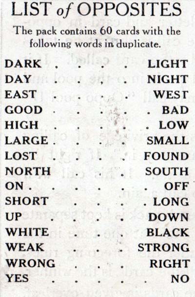 Above: czrds from “Oppo”, a game of opposites, published by J. Jaques & Son, Ltd, c.1920s. The set contains a total of 60 cards + rules in box.