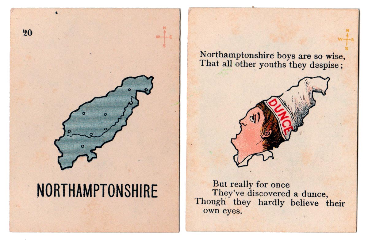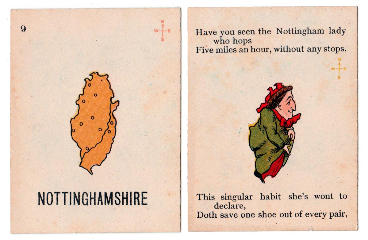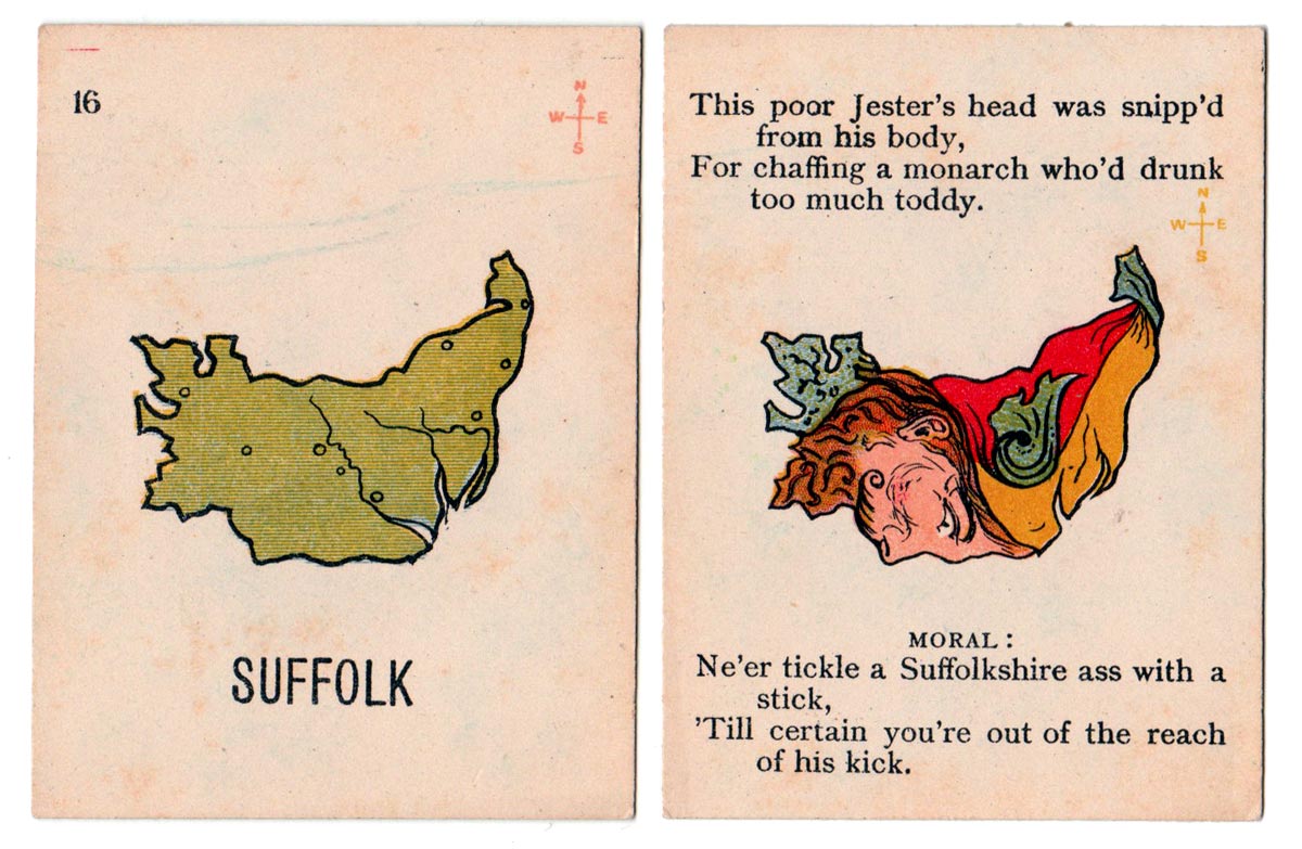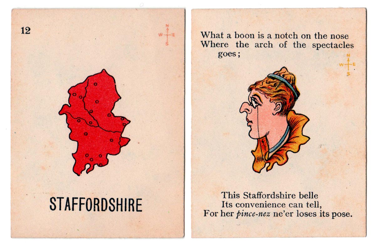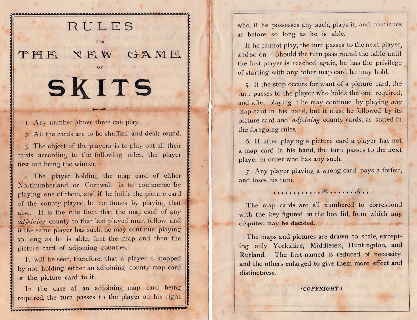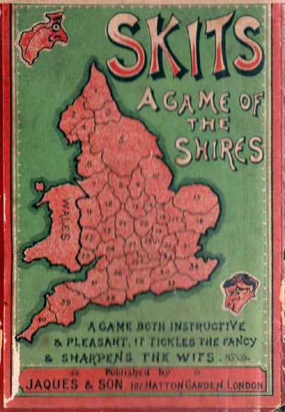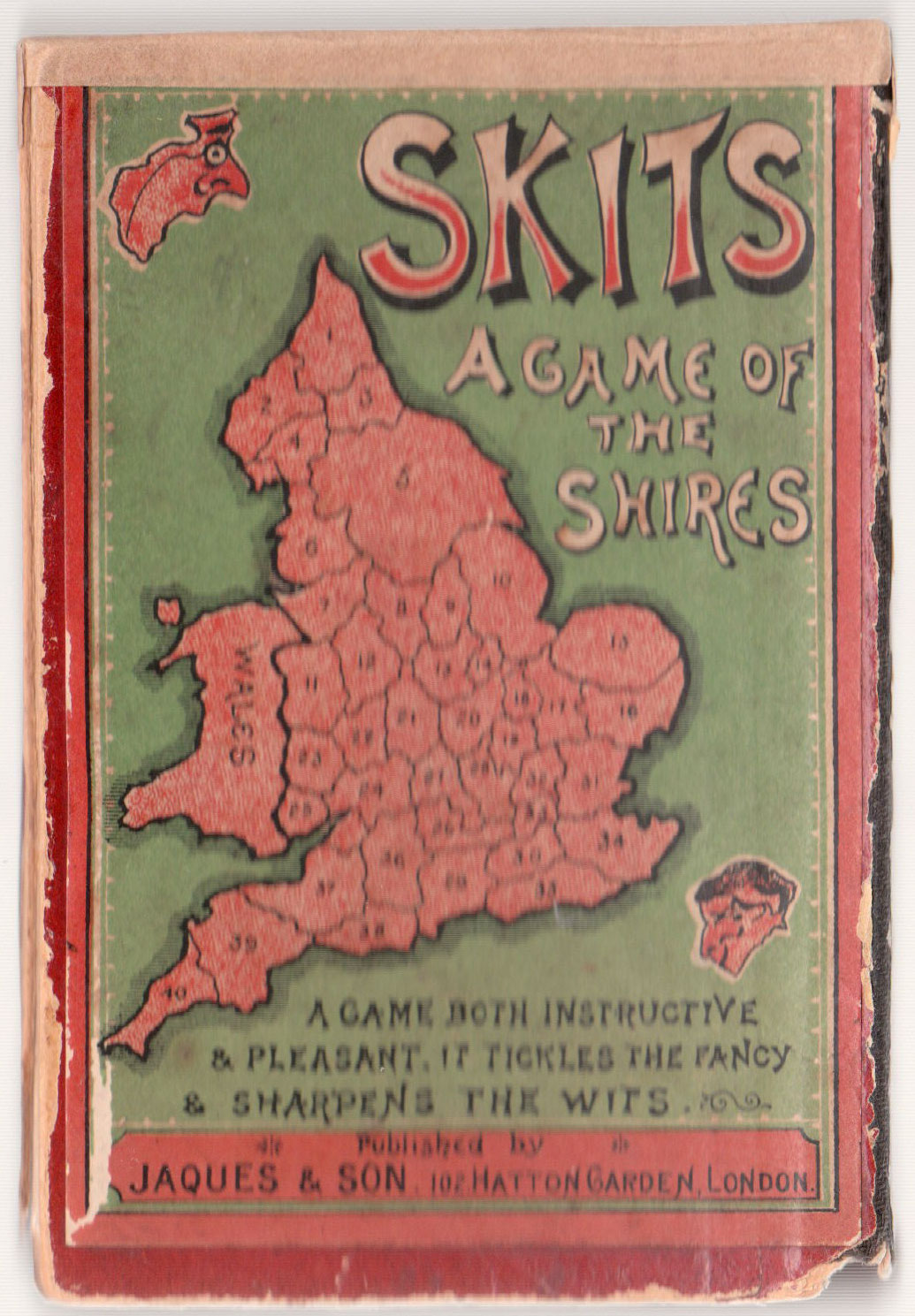 Skits is a geographical card game based around the counties of England, published by Jaques & Son, 102 Hatton Garden, London, c.1900. Described on the box (right) as “a game of the shires, both instructive and pleasant, it tickles the fancy and sharpens the wits.” The cards contain caricatures and also amusing verse. The object of the game is to match map cards with their picture cards, and to play out all your cards to win. See the Rules►