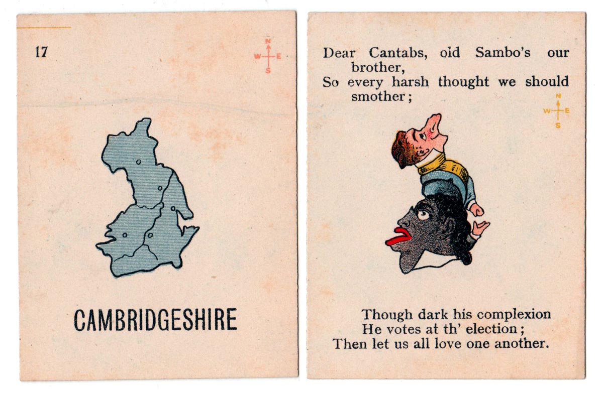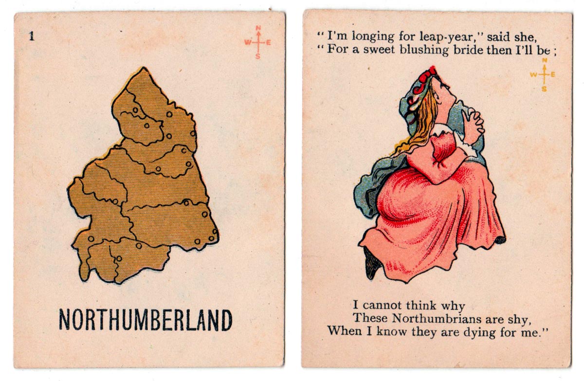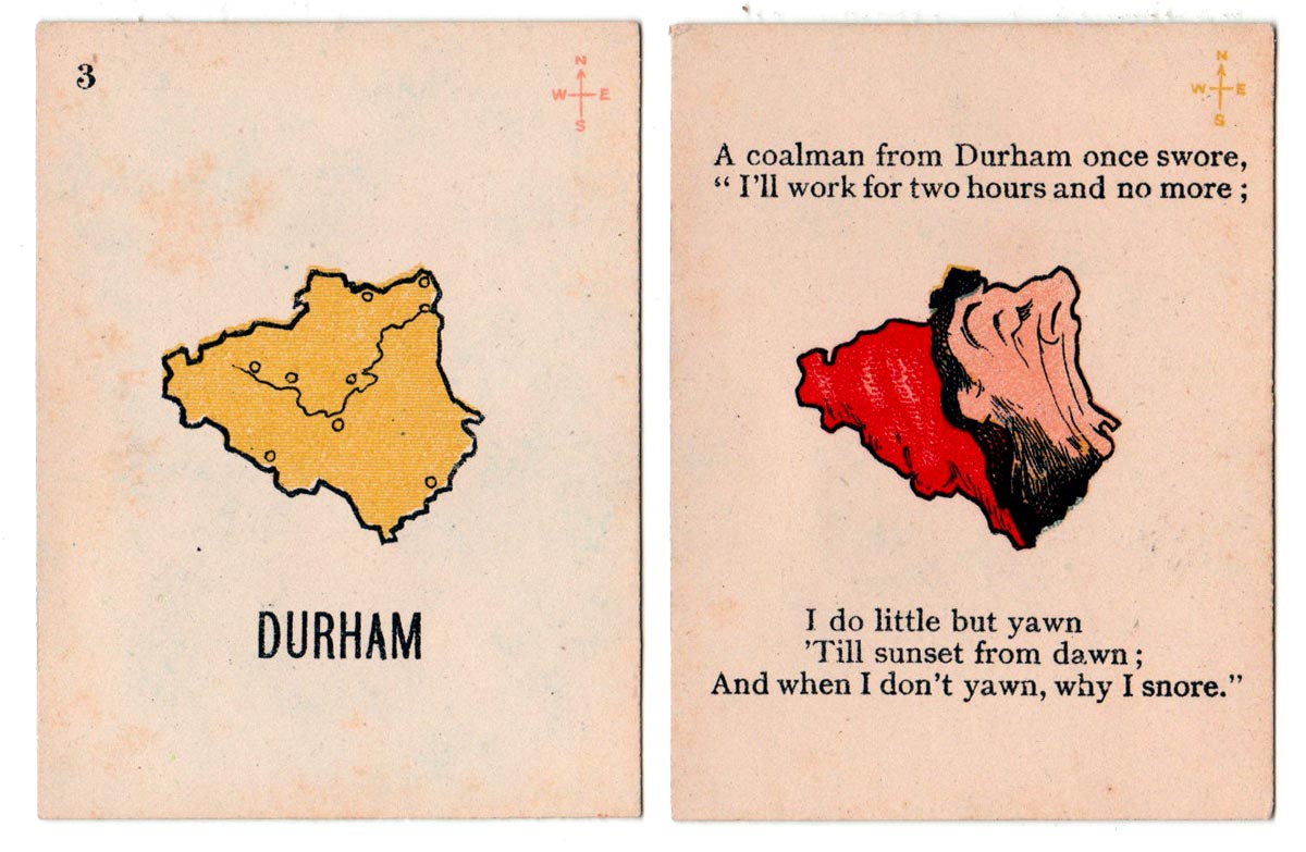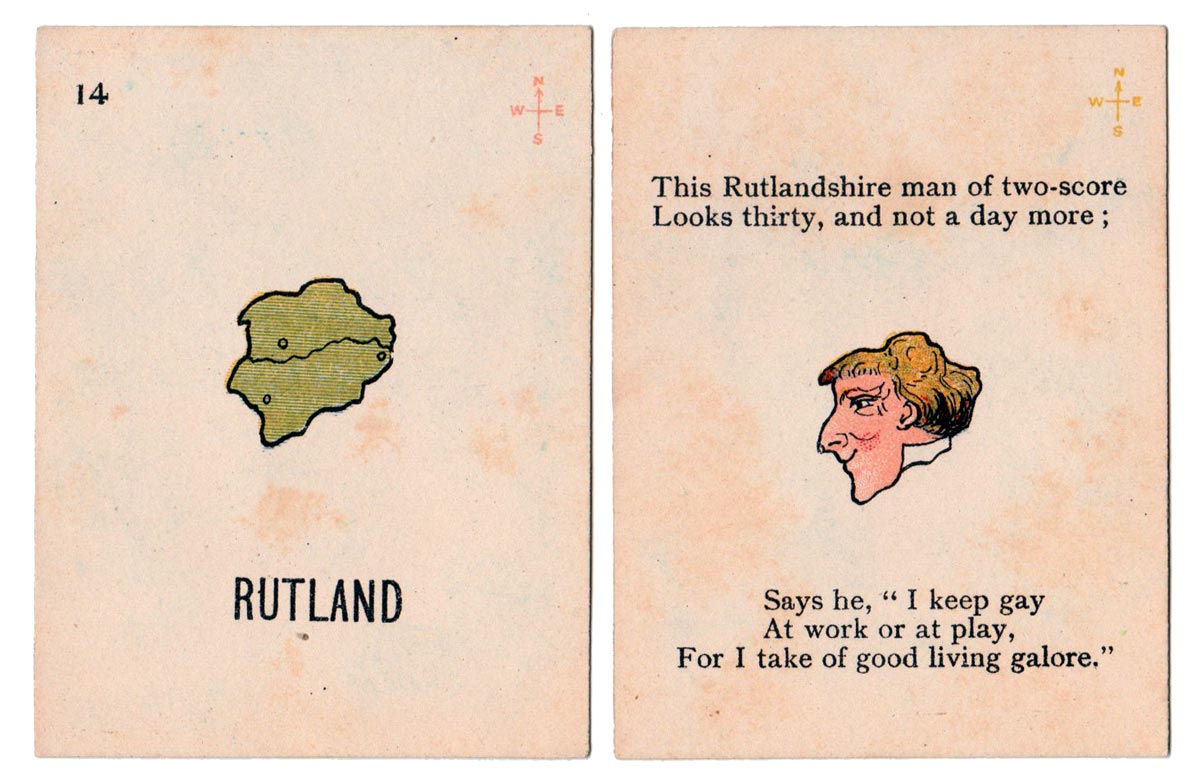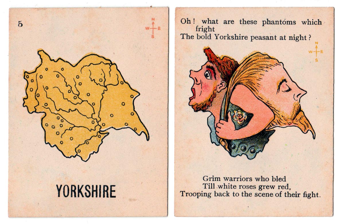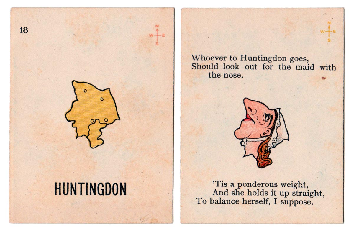 Skits is a geographical card game based around the counties of England, published by Jaques & Son, 102 Hatton Garden, London, c.1900. Described on the box (right) as “a game of the shires, both instructive and pleasant, it tickles the fancy and sharpens the wits.” The cards contain caricatures and also amusing verse. The object of the game is to match map cards with their picture cards, and to play out all your cards to win. See the Rules►