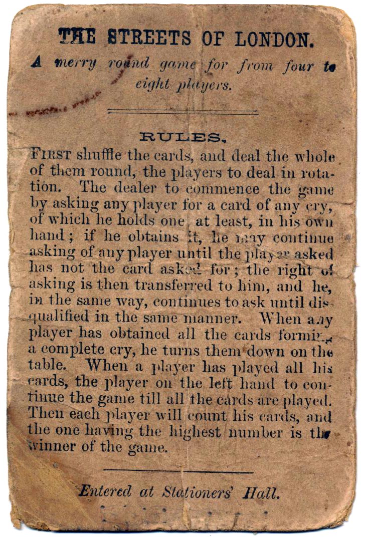 Victorian parlour game described as “a merry round game for from four to eight players” published by John Jaques & Son, London, c.1880. The complete street cry is printed along the top of each card and players compete to complete the most sets of street cries.