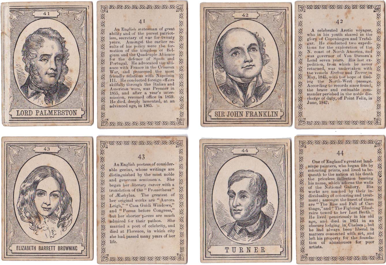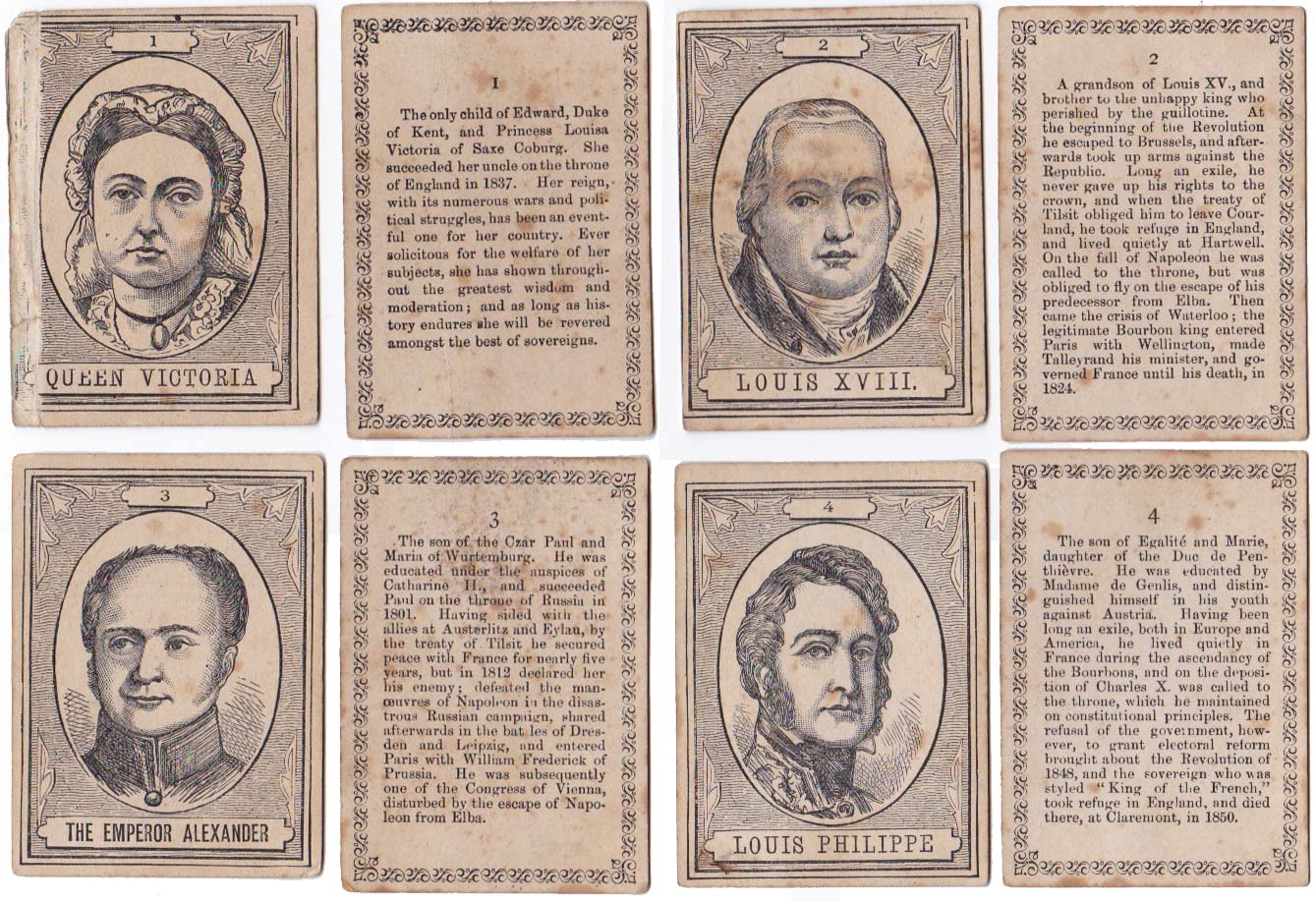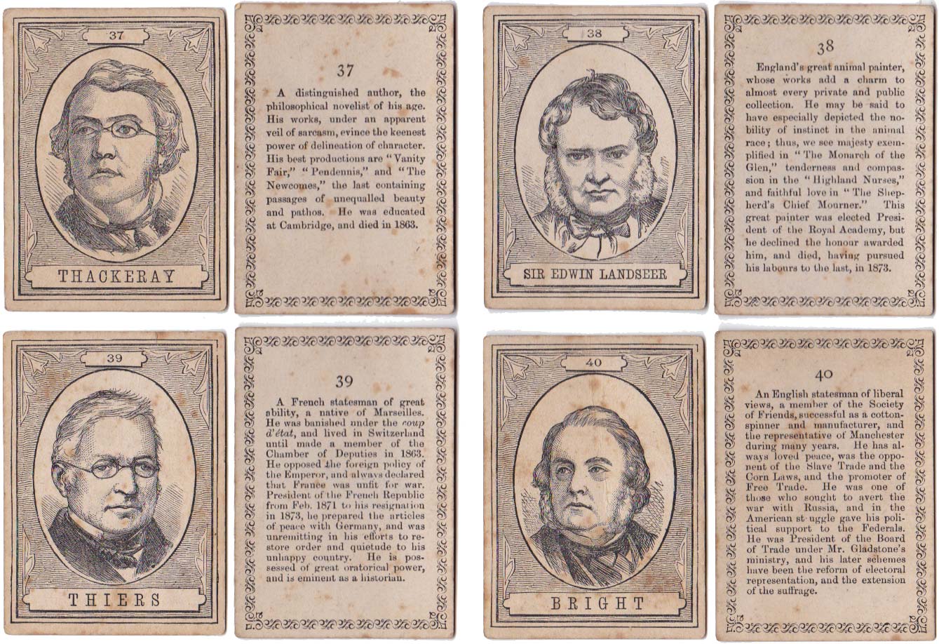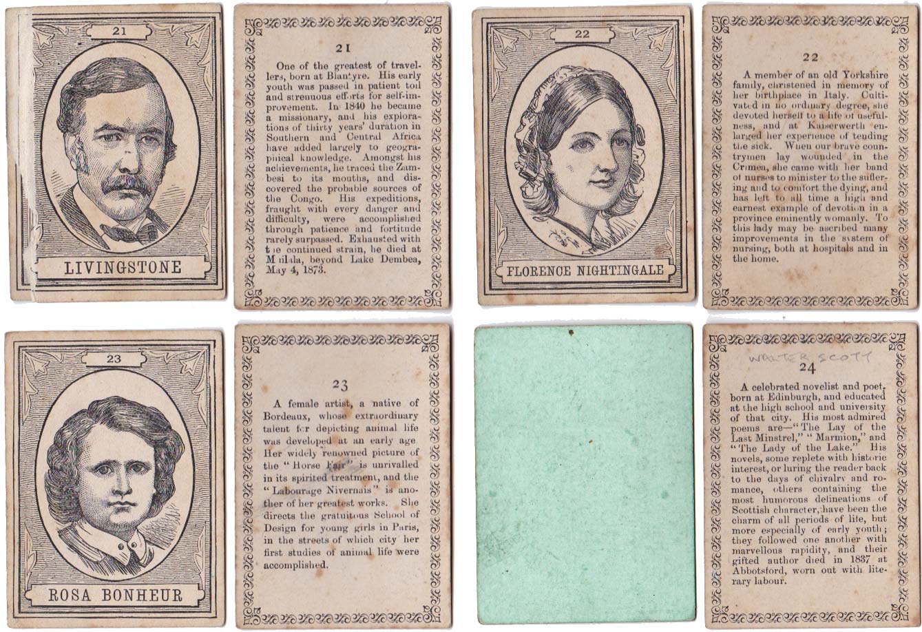Above: cards from The XIXth Century game published by John Jaques & Son, c.1875. 100 cards in box. Cards size: 5.3 x 7.5 cm. Click on images to zoom.