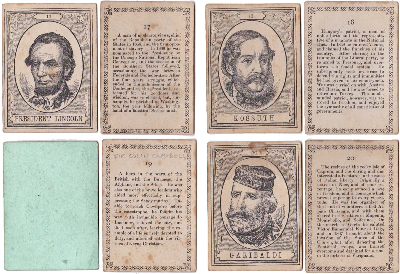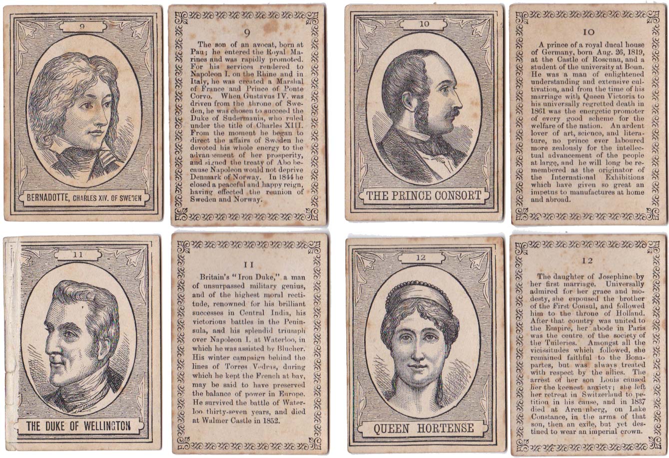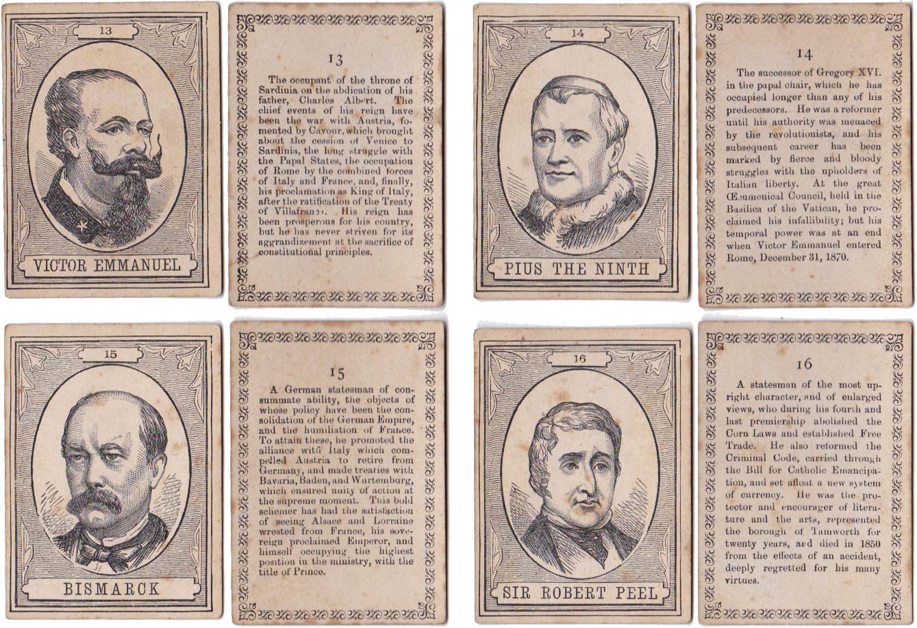 Above: cards from The XIXth Century game published by John Jaques & Son, c.1875. 100 cards in box. Cards size: 5.3 x 7.5 cm. Click on images to zoom.