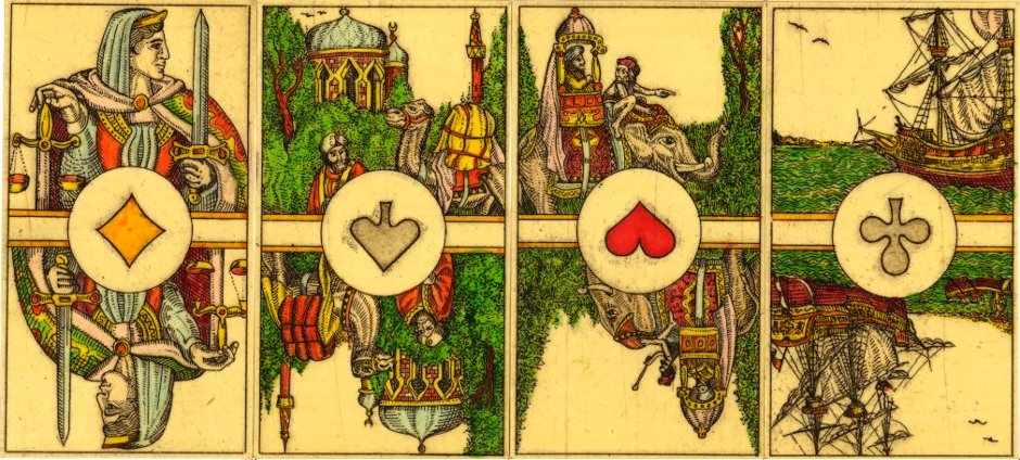 The Aces are decorated with the pip in a central circle and two different figures at each end of the...