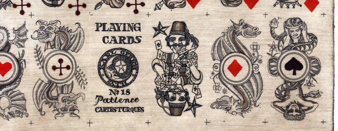 Above: Karl Gerich No.18: Cartes Turques Patience, printed from copperplate etching and hand-coloured, published 1991. 32 cards + Joker + 2 additional cards; 34mm x 63mm. (Click image to see more)