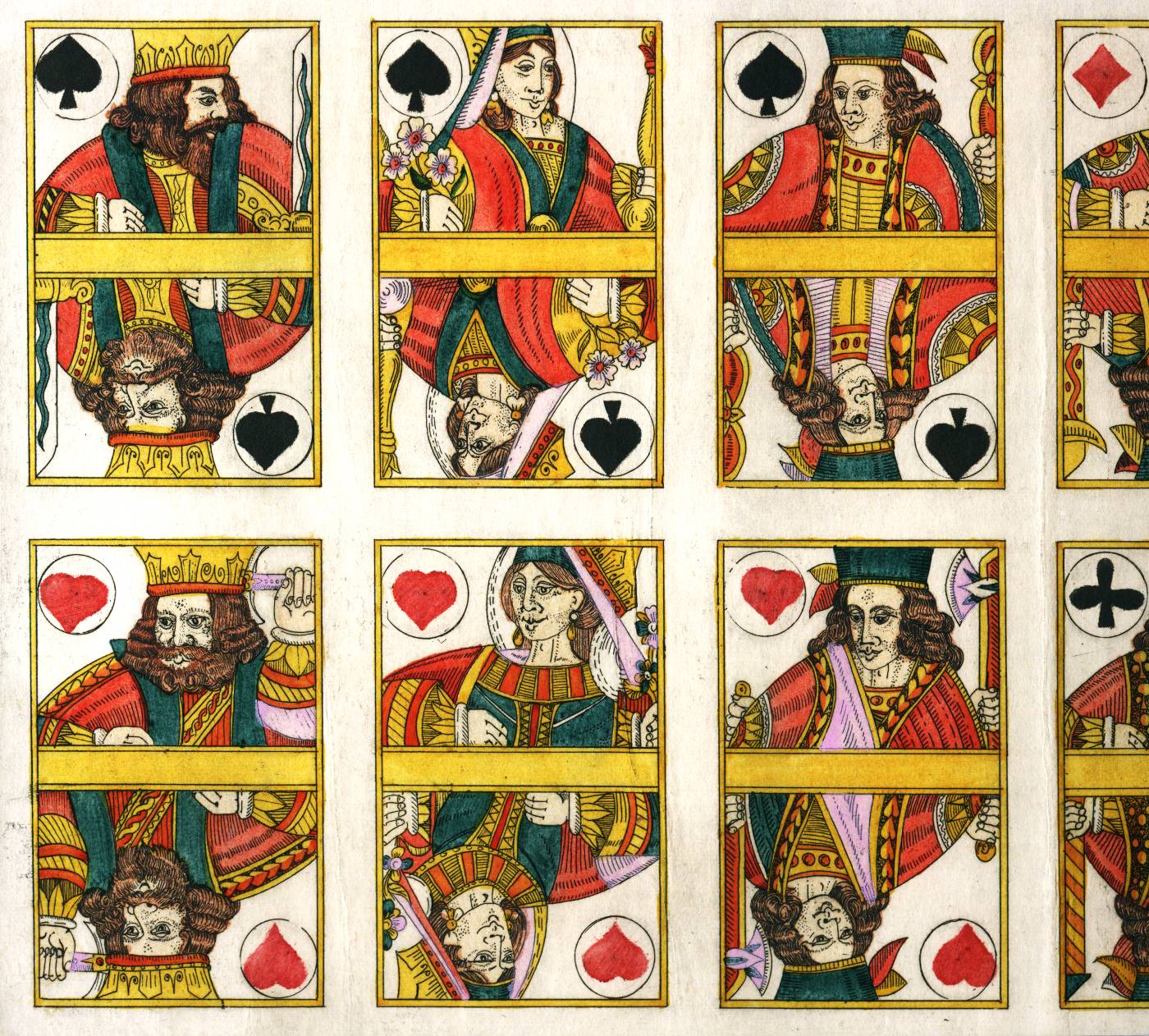 The Aces are decorated with the pip in a central circle and two different figures at each end of the...