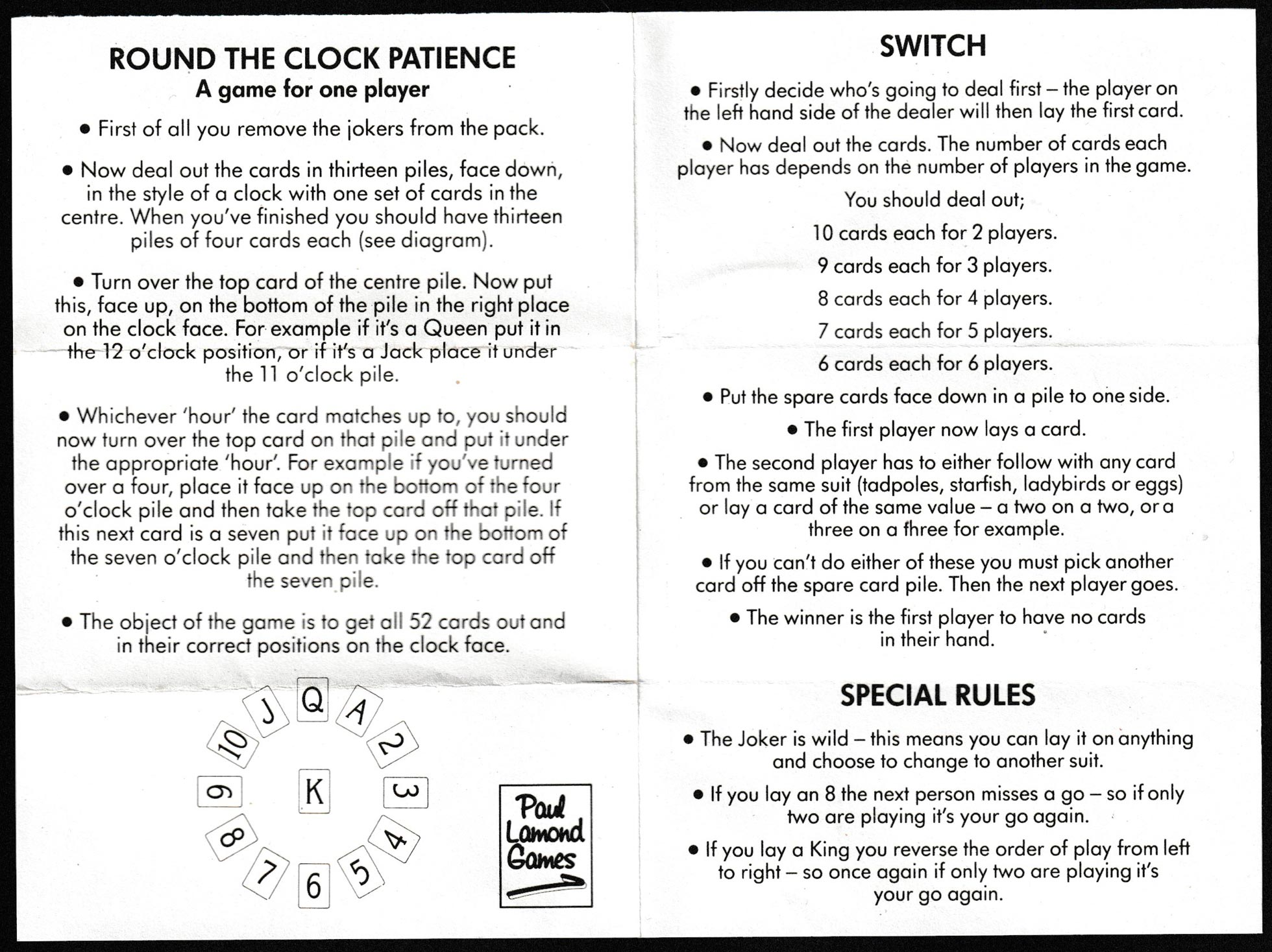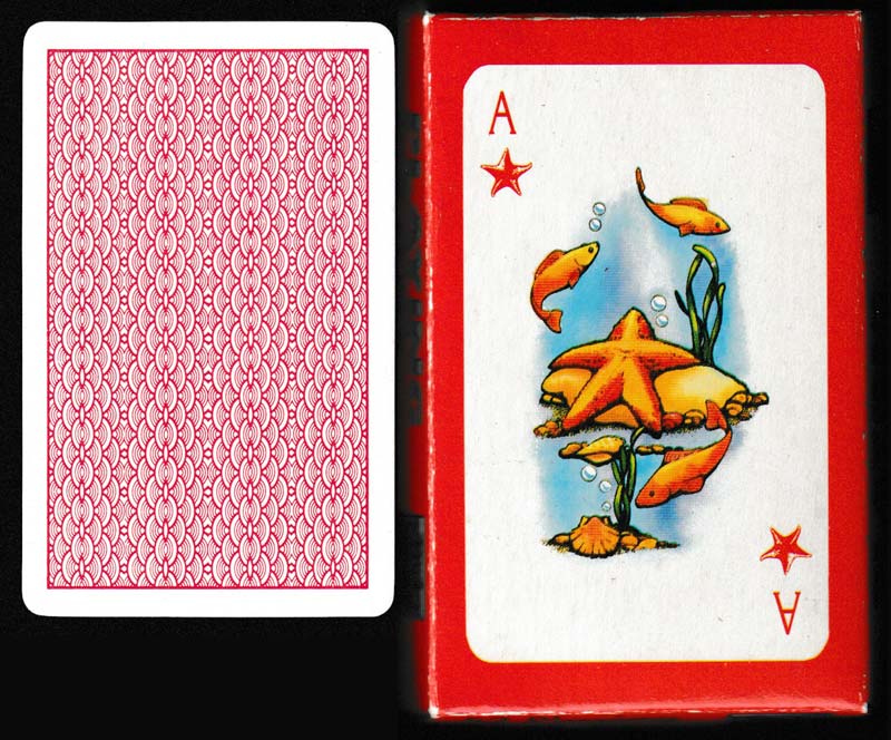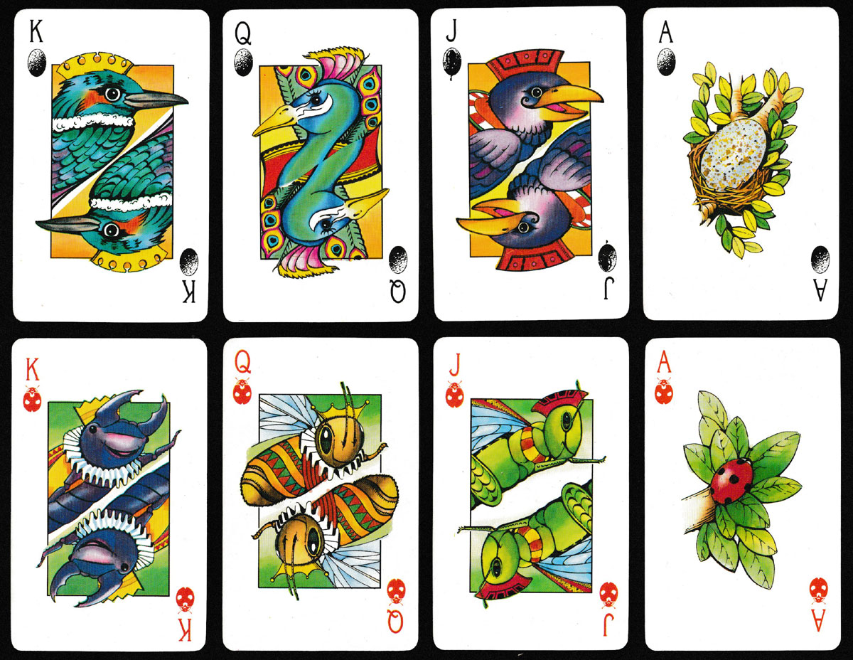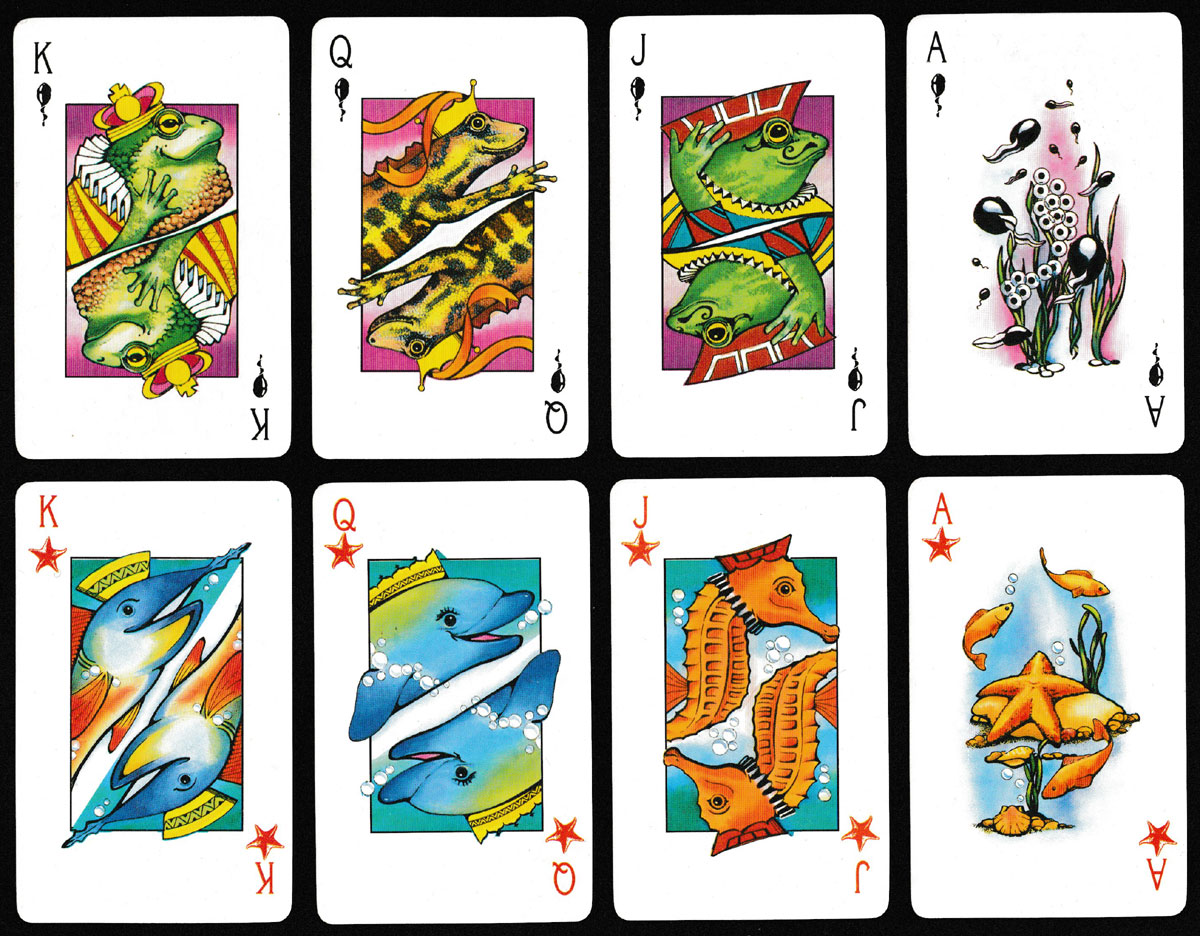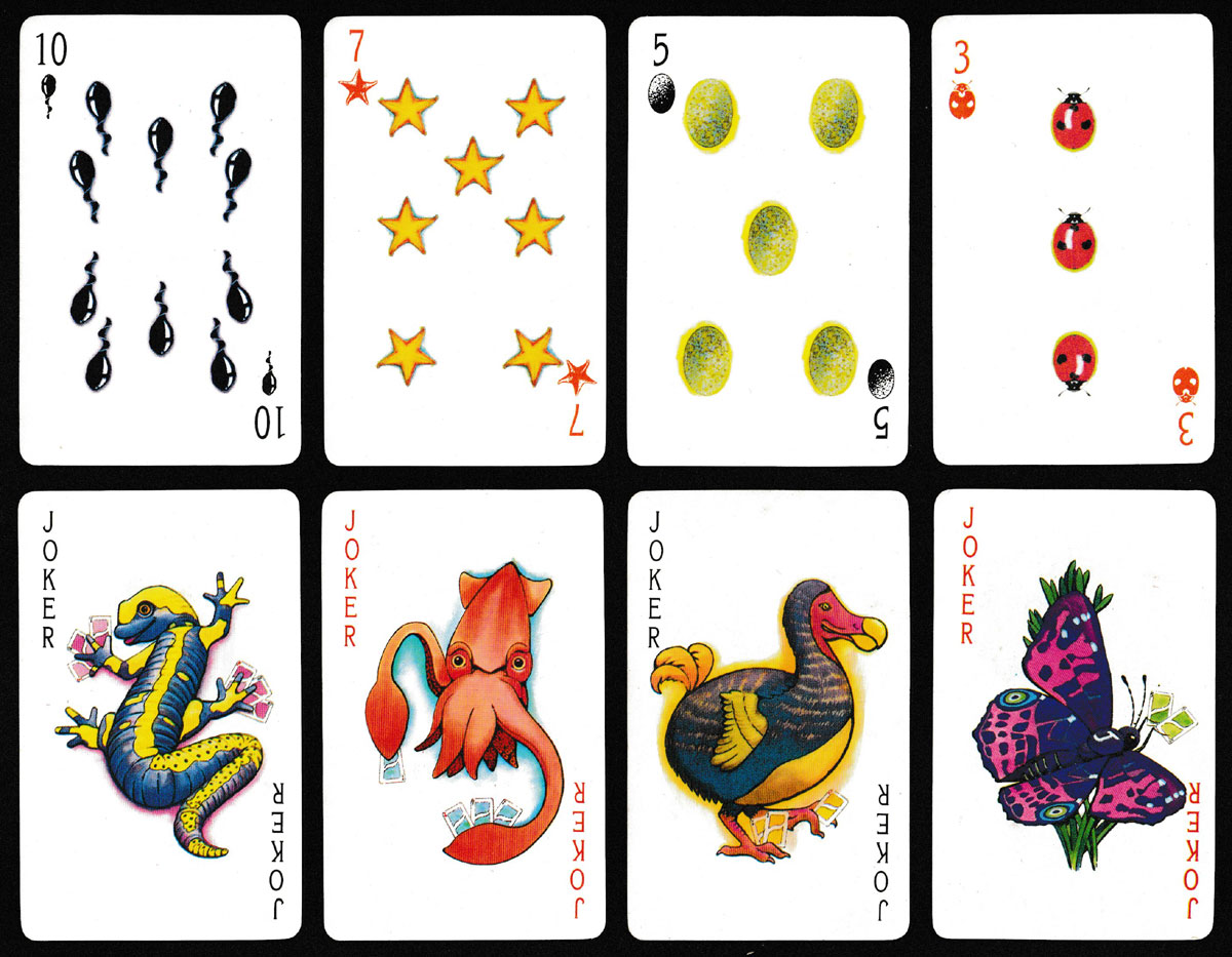 Sometimes, in order to obtain an interesting pack of cards, it is necessary to buy a larger, boxed set of games or perhaps a book. The cards shown here were never sold separately but rather as part of a bumper pack of games and puzzles. The black suits are tadpoles and birds’ eggs, while starfish and ladybirds can be found on the red ones. The court cards and Jokers represent amphibians, birds, sea creatures and insects, all depicted light-heartedly and colourfully in a manner designed to appeal to children. The target audience for this boxed set was kids aged 4 to 7 • see the outer box