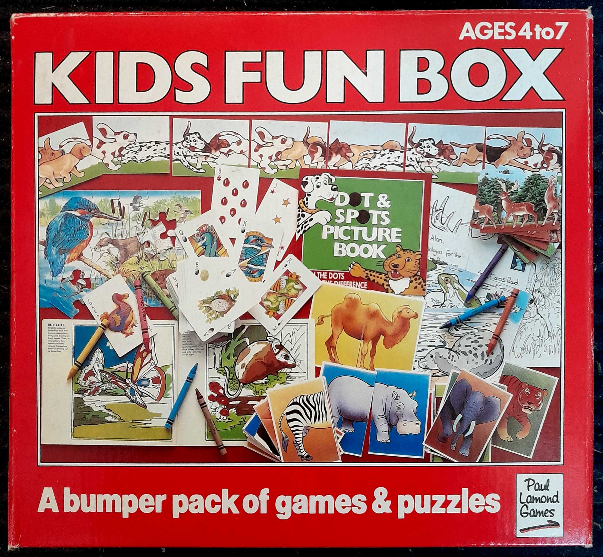 Above: Kids Fun Box playing cards published by Paul Lamond Games, London, UK, 1991. Made in China. 52 cards + 4 Jokers + patience rules in drop-lid box. Size: 55 x 88 mm. Part of a large boxed set also containing an animal colouring book, a Dot & Spot picture book, 18 colouring postcards, a 25-piece jigsaw puzzle, a 56-card match two floor game, 5 animal frieze puzzles, a 35-piece square puzzle, and 8 non-toxic crayons.
