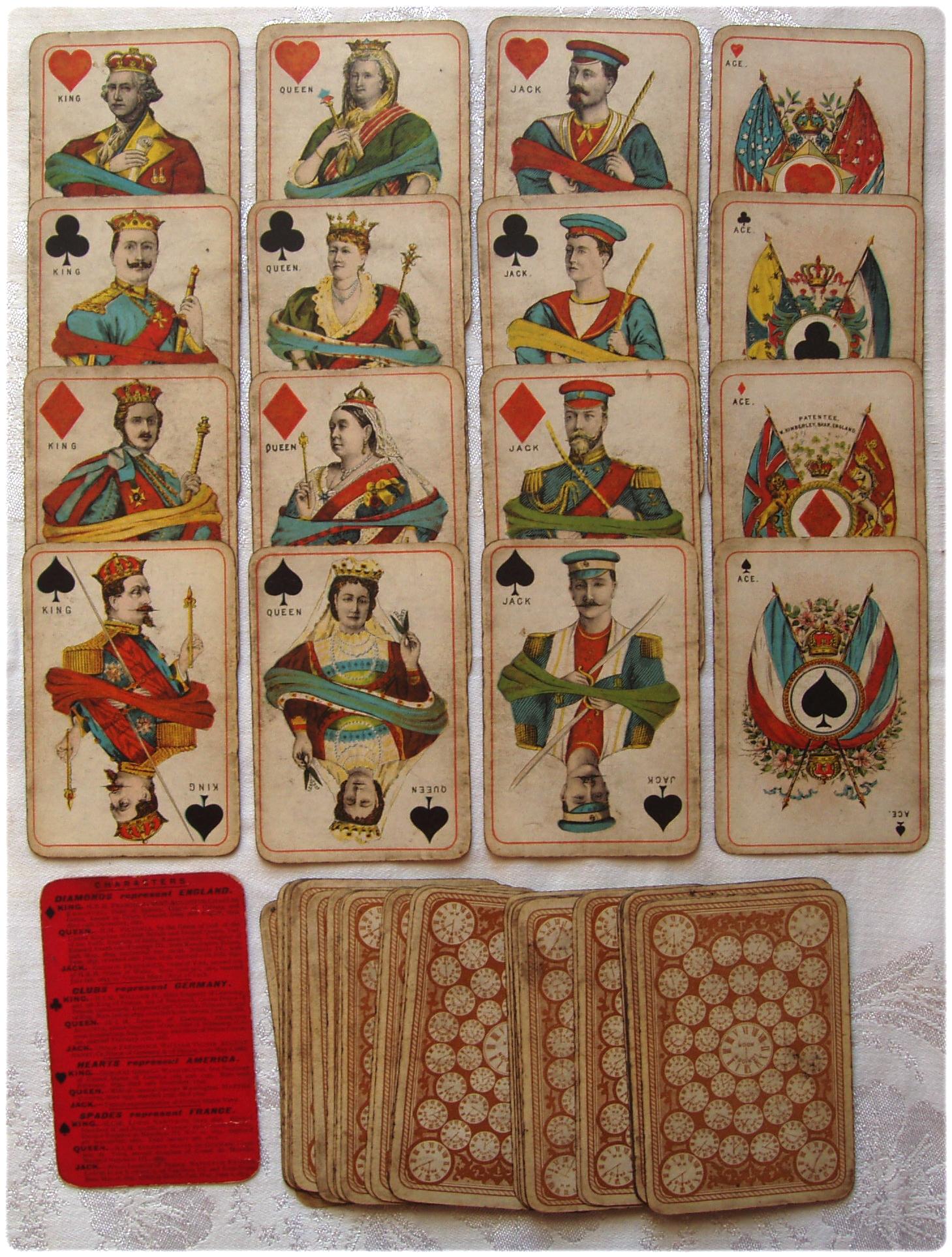 Kimberley’s National Patriotic playing cards represent four nations: Diamonds represent England, Hearts represent America, Spades represent France and Clubs represent Germany. The Ace card of each suit represents the Royal Standard or flag of each Nation. For England (Diamonds) the Union Jack; for America (Hearts) the Stars and Stripes; for France (Spades) the National Colours and for Germany (Clubs) their Royal Standard. Courts represent contemporary and past royalty. The backs usually show an array of clocks in various colours.