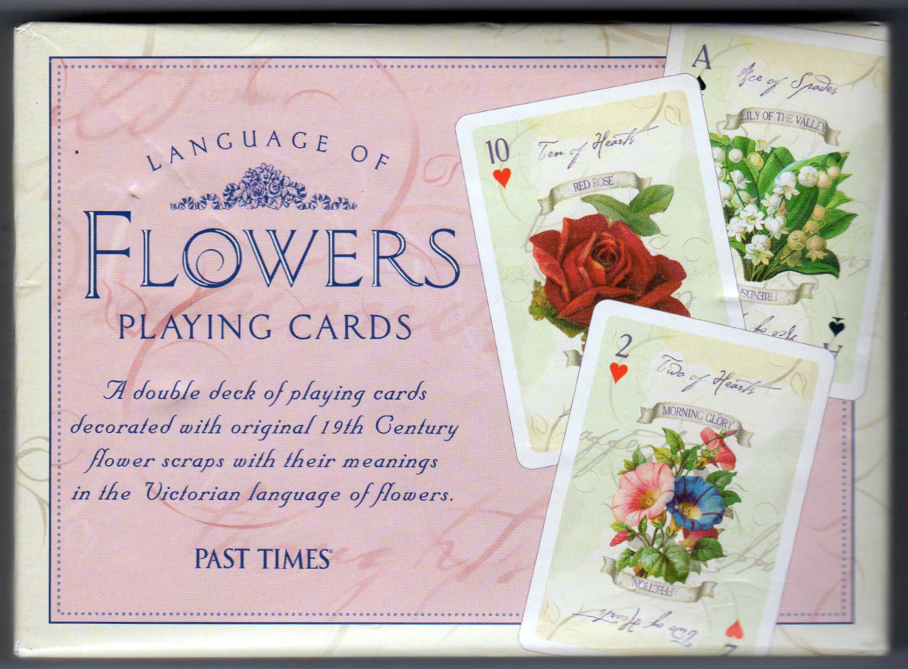 Above: Language of Flowers double set playing cards published by Past Times, c.1999. 52 cards + 3 jokers in each pack, over-sized poker-width cards.