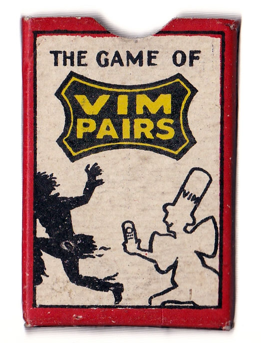 Above: Lever Brothers miniature card game promoting Vim, 1930s. 30 cards plus the coloured Dirty Work Card. The black and white Dirty Work card is the back design. Card size = 35mm x 52mm.