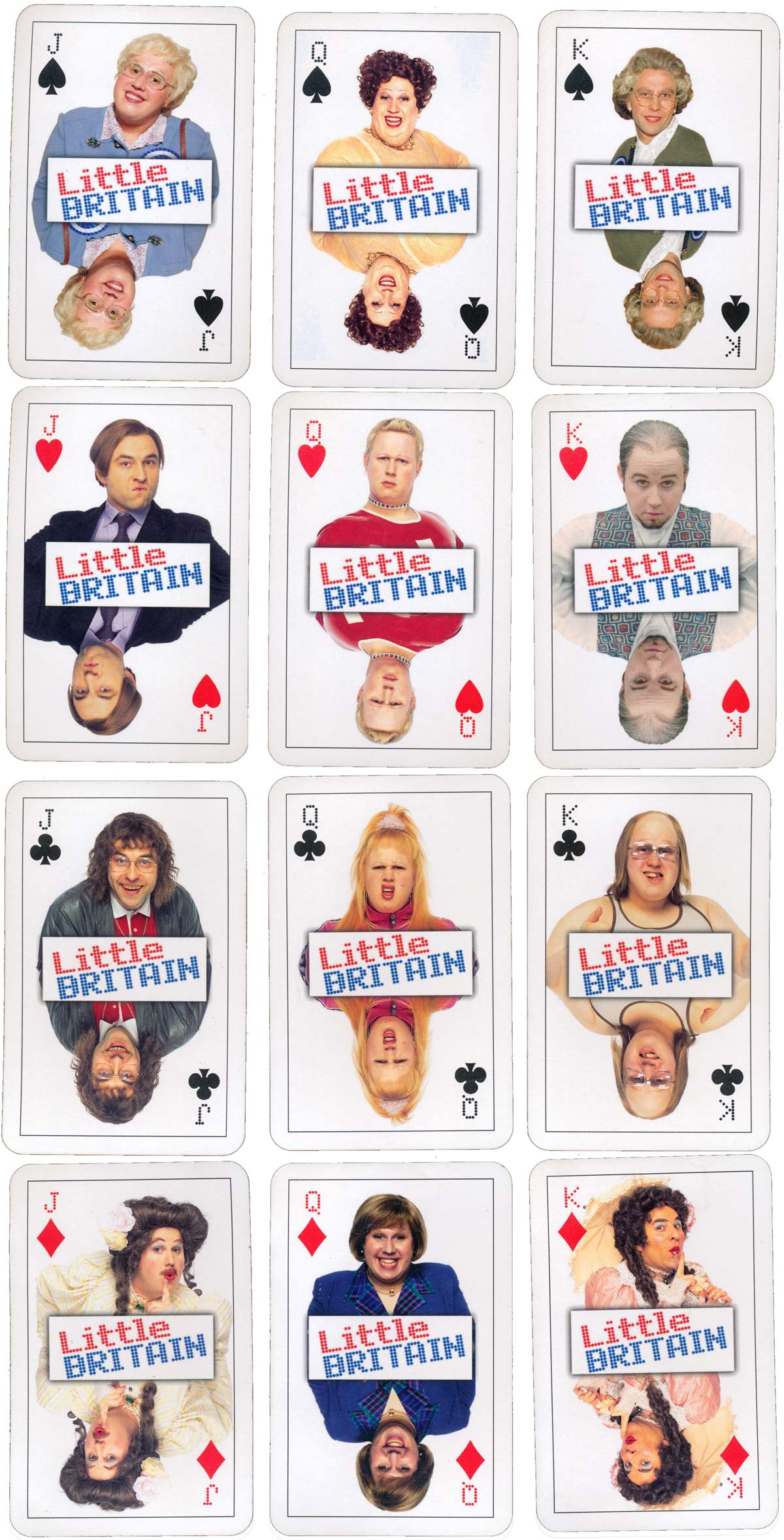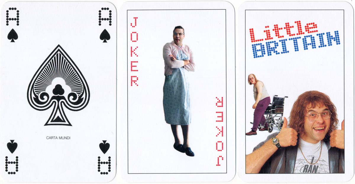 “Little Britain” fan deck published by the BBC in 2005. The custom courts and jokers feature characters from the comedy sketch show which was created by Matt Lucas and David Walliams and ran between 2003 - 2007.