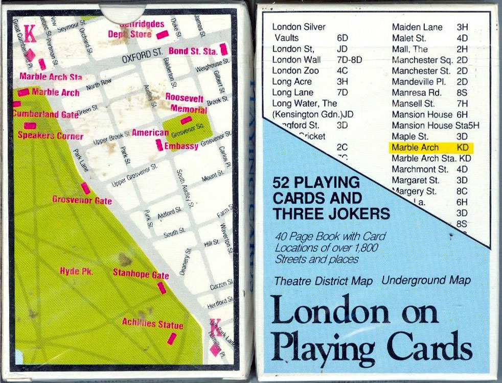 Above: cards from “London on Playing Cards” published by Yasha Beresiner, Intercol, London. The complete pack contains 52 cards + 3 jokers + booklet in box, printed by Carta Mundi, 1989.
