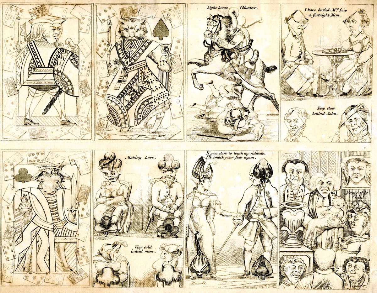 Transformation playing cards, first published in 1811. Each card bears a picture in which the suit marks are concealed within the design. This artistic exercise began as a late 18th century pastime.