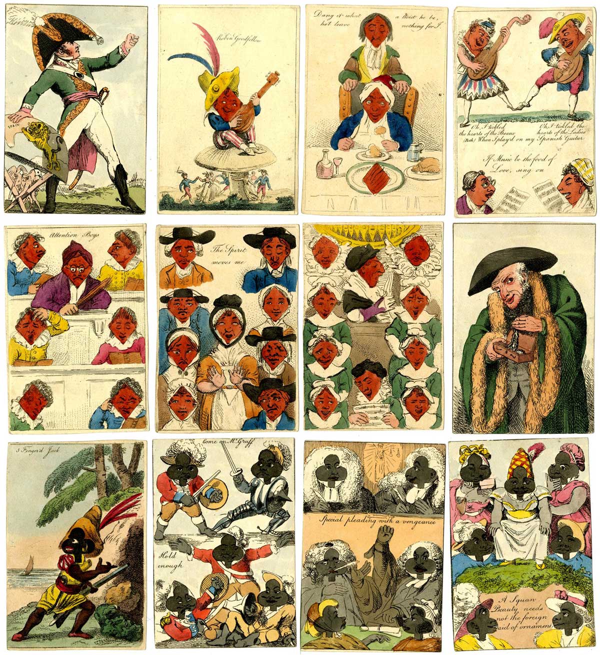 Above: 16 cards from Cowell's Transformation Cards, 1811. The complete set of five sheets is accompanied by a wrapper bearing the royal arms, with the title "Metastasis. Transformation of Playing Cards", and "Designed and Etched by I.L.S. Cowell". © The Trustees of the British Museum • Cowell's Transformation Cards►