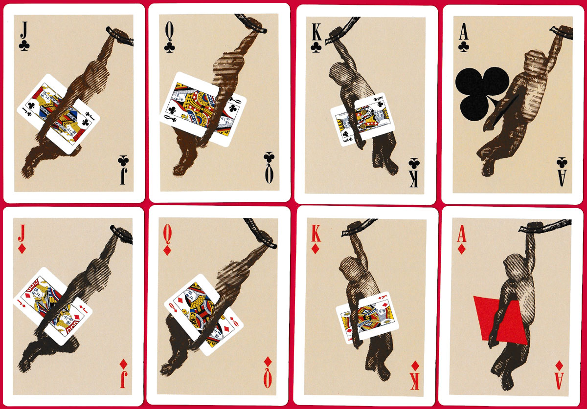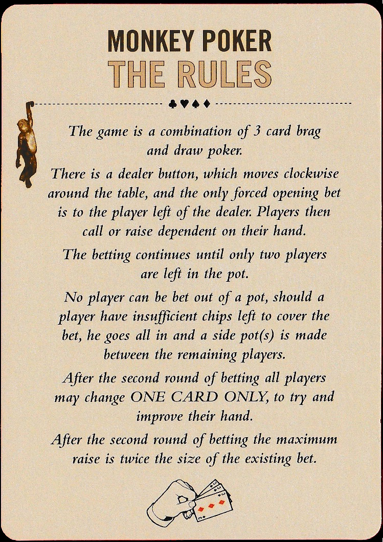 This pack was clearly produced to promote and advertise the whisky, and monkeys feature prominently on all 52 cards and the 2 jokers. On the pip cards they can be seen swinging freely, with 3 or 4 monkeys on each card, while on the court cards they are swinging and holding a standard jack, queen or king court to indicate their rank. There is an extra card explaining the rules and ranking of Monkey Poker. See the rules►
