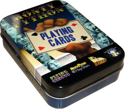 The backs of the cards are printed with a collage of characters from the television series and the logo-titles of the films and television show. The deck is supplied in a standard cardboard tuck-box, within a tin (click to zoom).